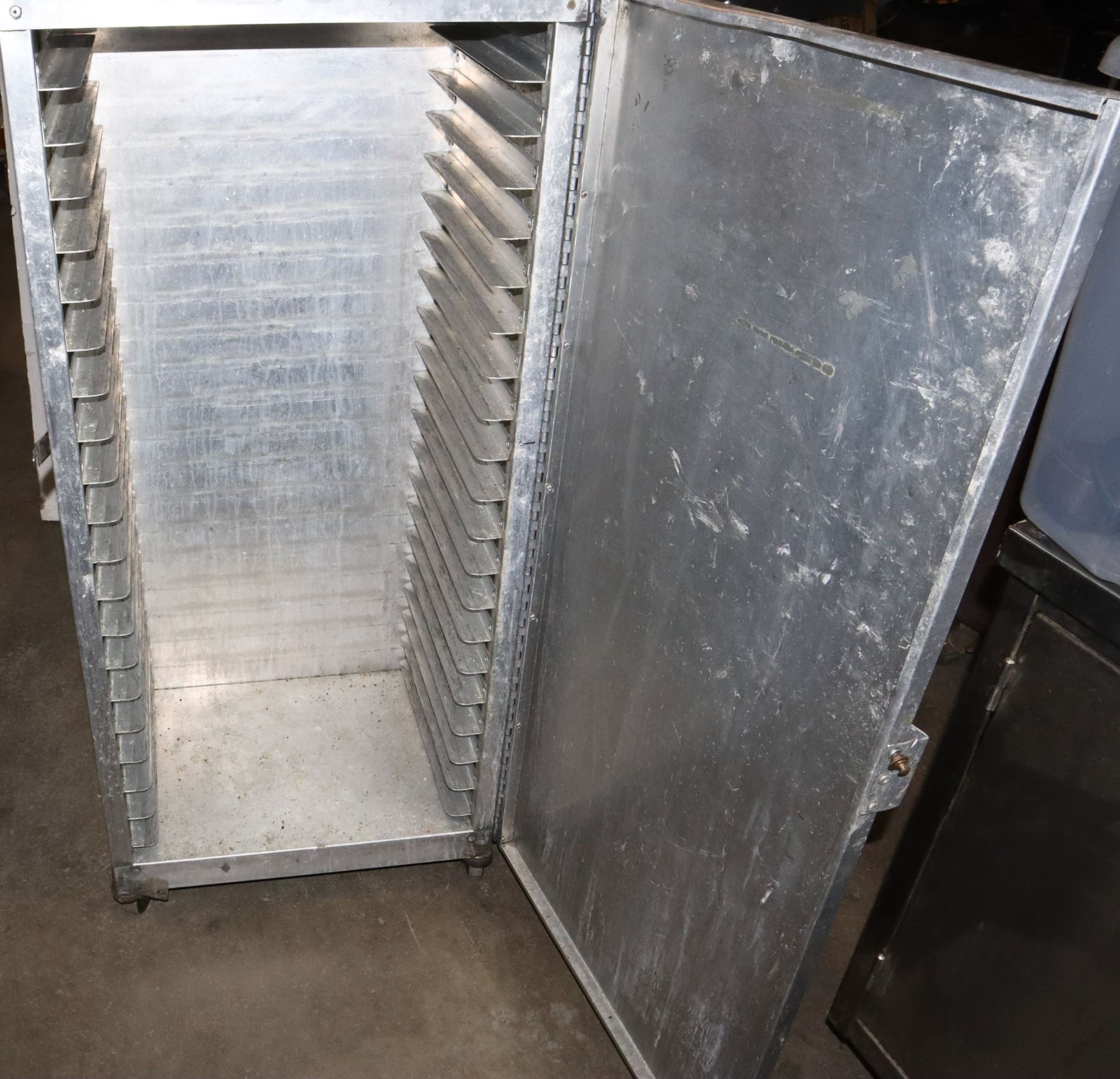 APPROX 49" TOTAL HEIGHT. ONE WHEEL NEEDS TO BE ATTACHED TO RACK BETTER. DOOR LATCH NEEDS ADJUSTMENT