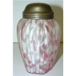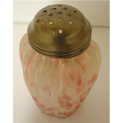 PINK & WHITE END OF THE DAY GLASS SUGAR SHAKER. Has silver plate top and shaker has ribbed design. 4.5" H.