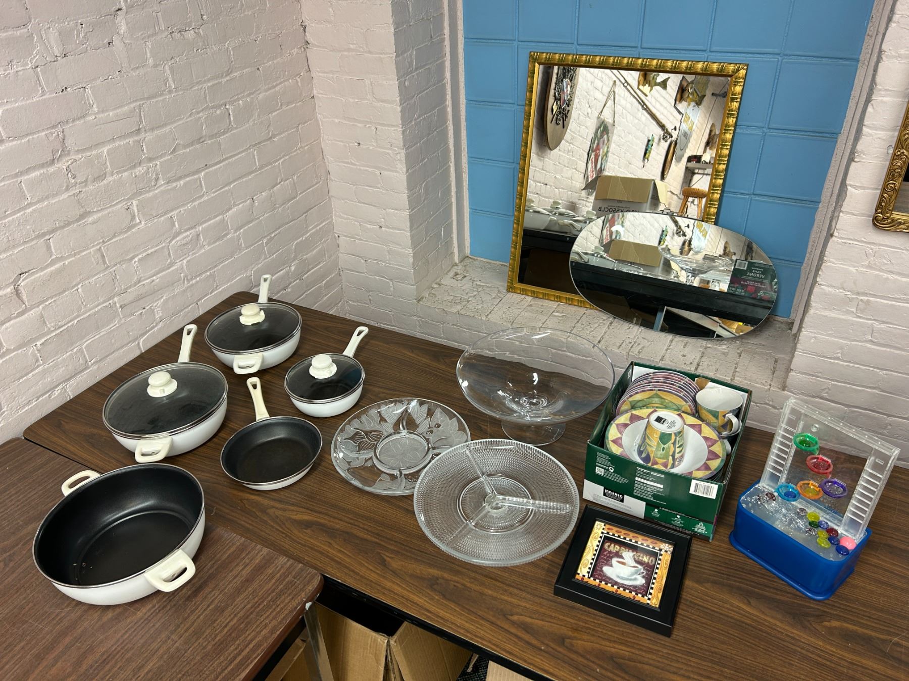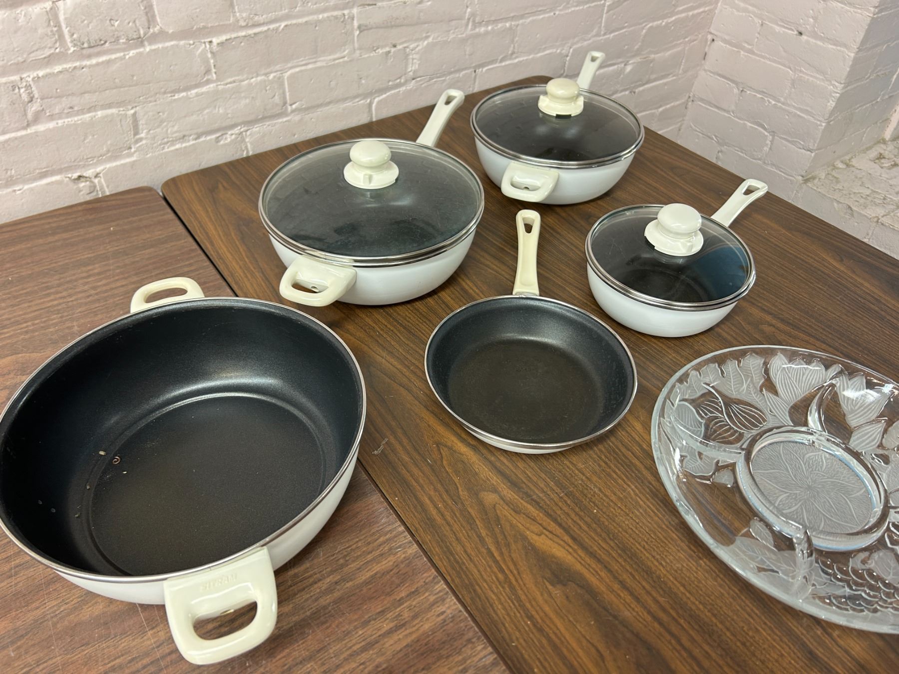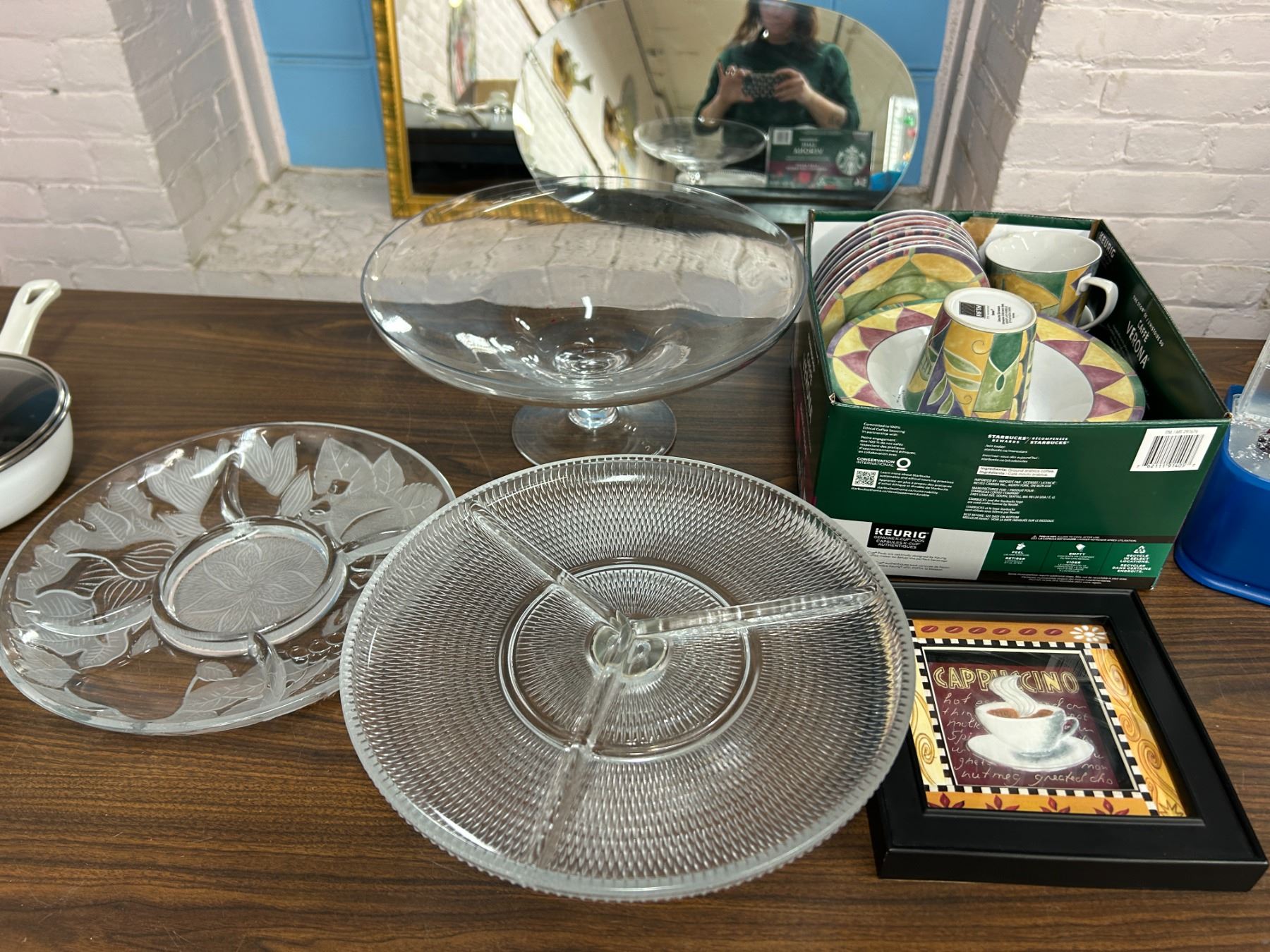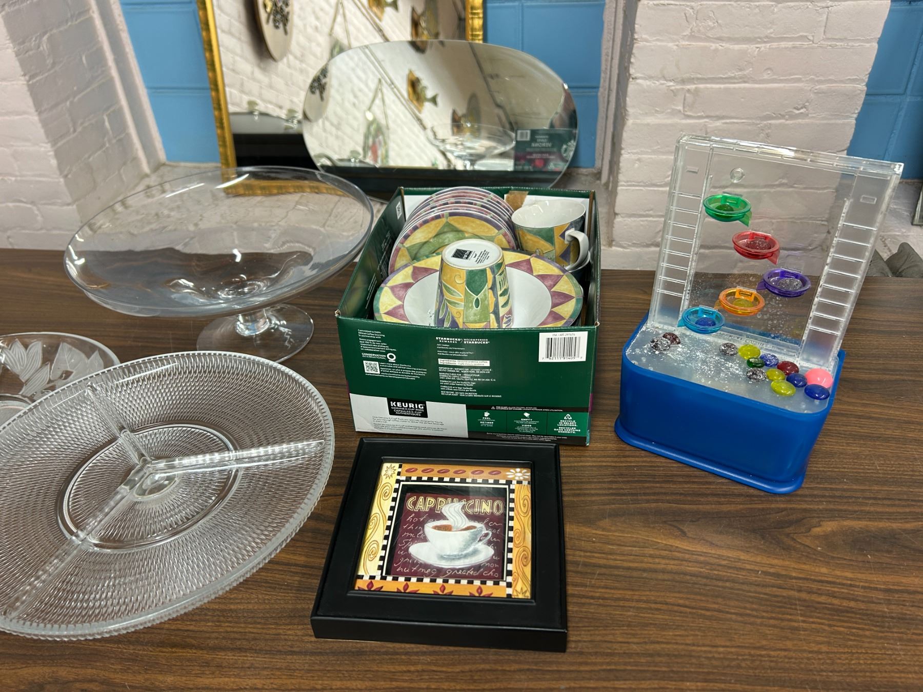 END OF THE RUN Glass Serving Footed Platters, Mugs and Plates Set, etc