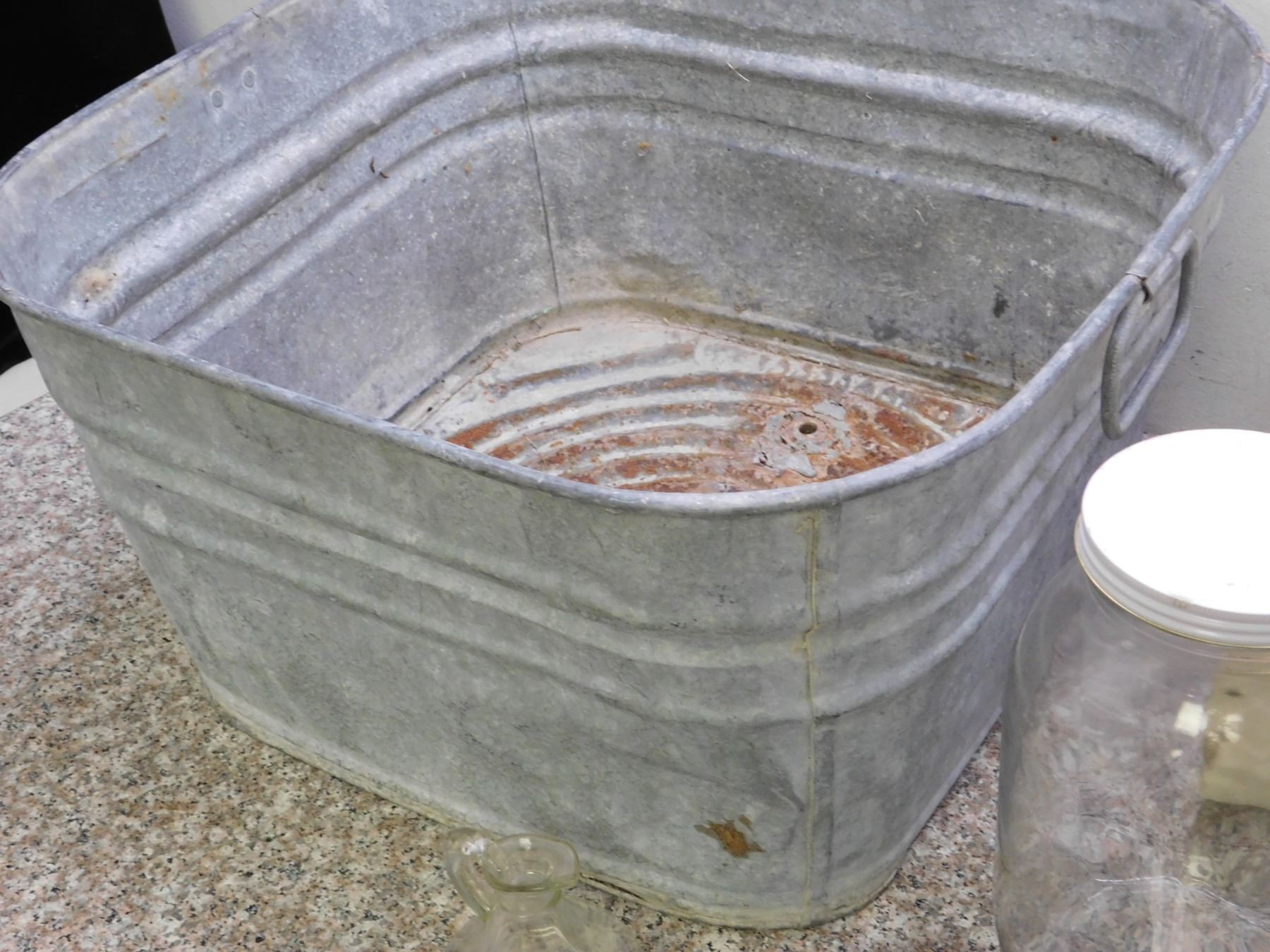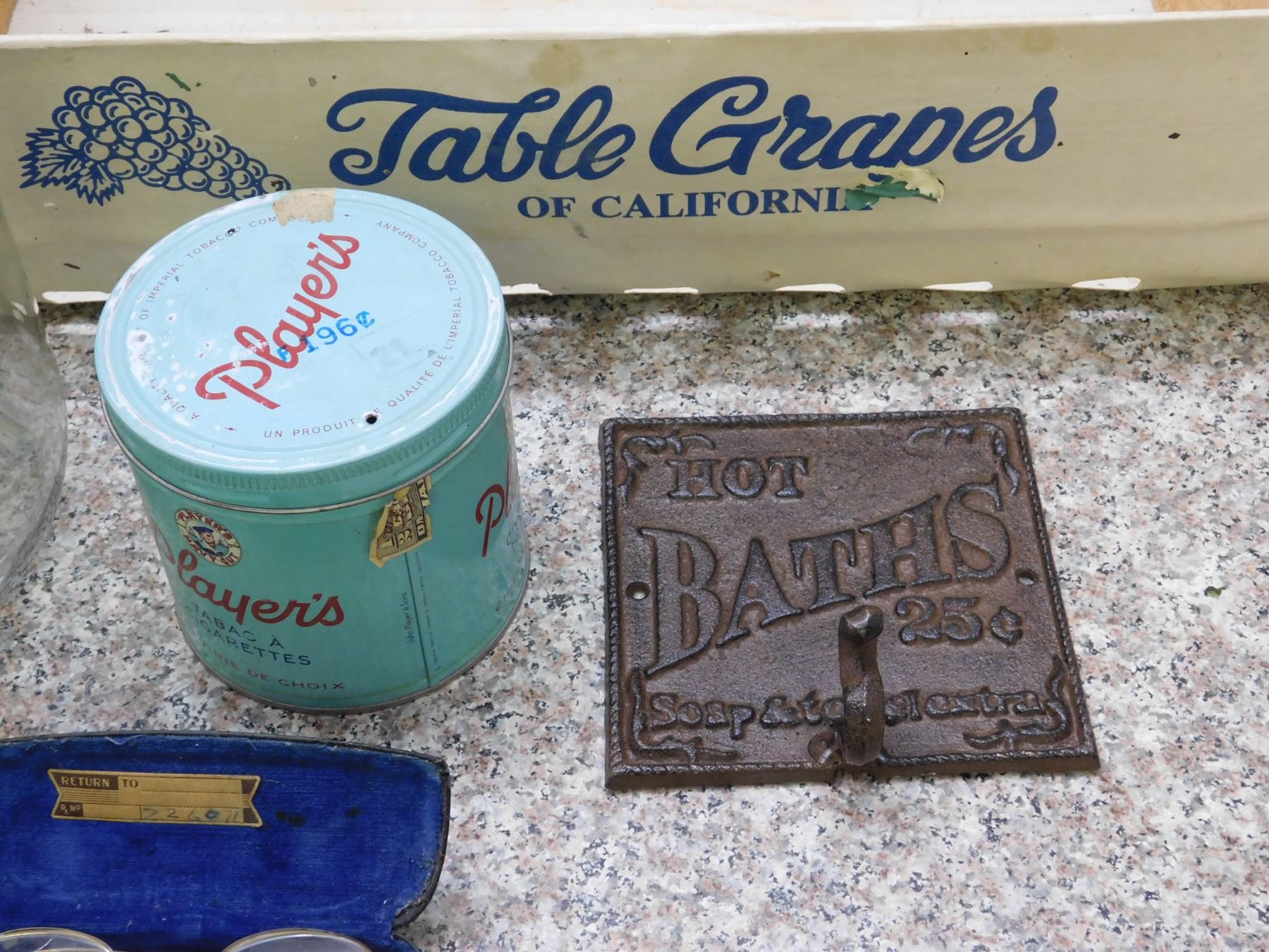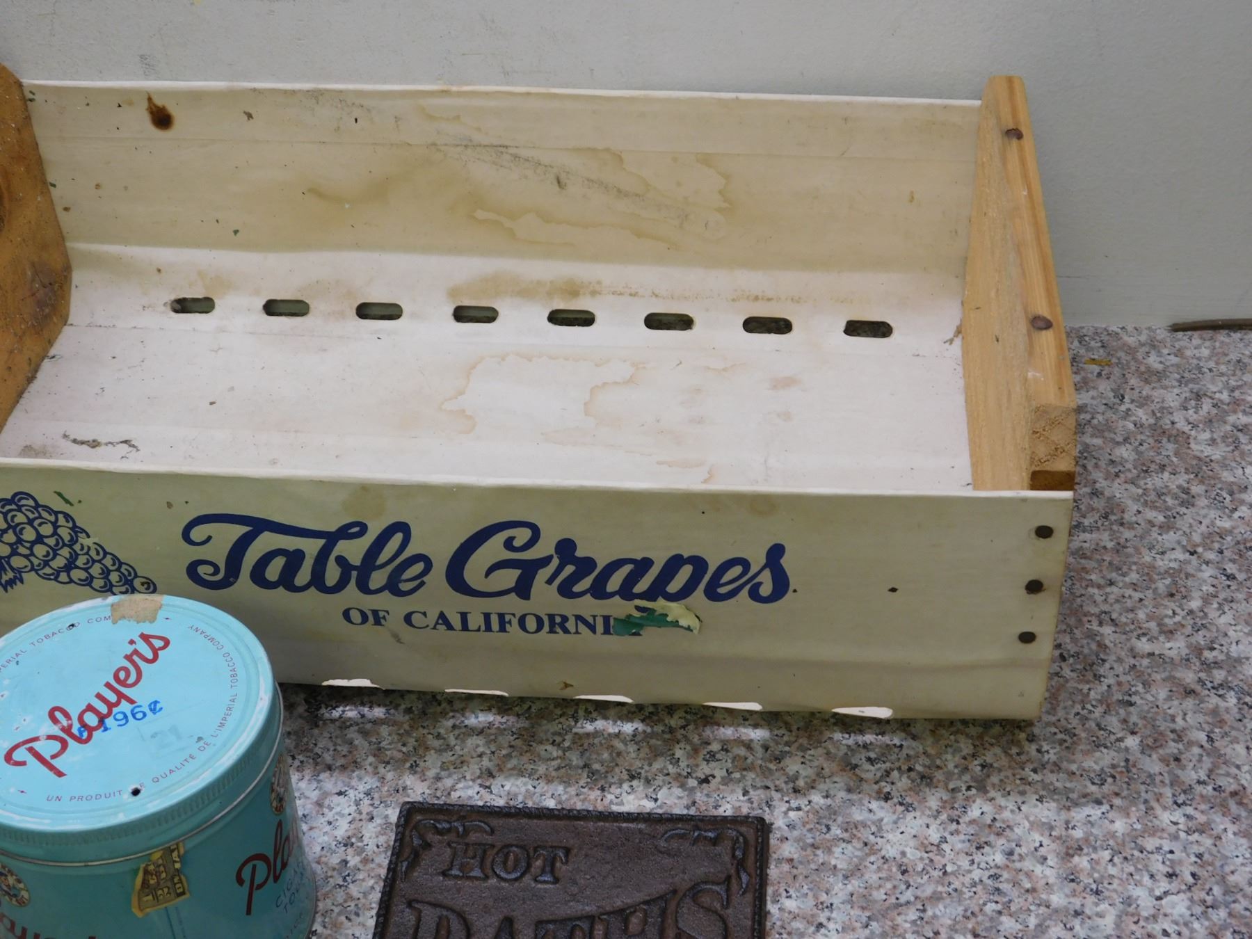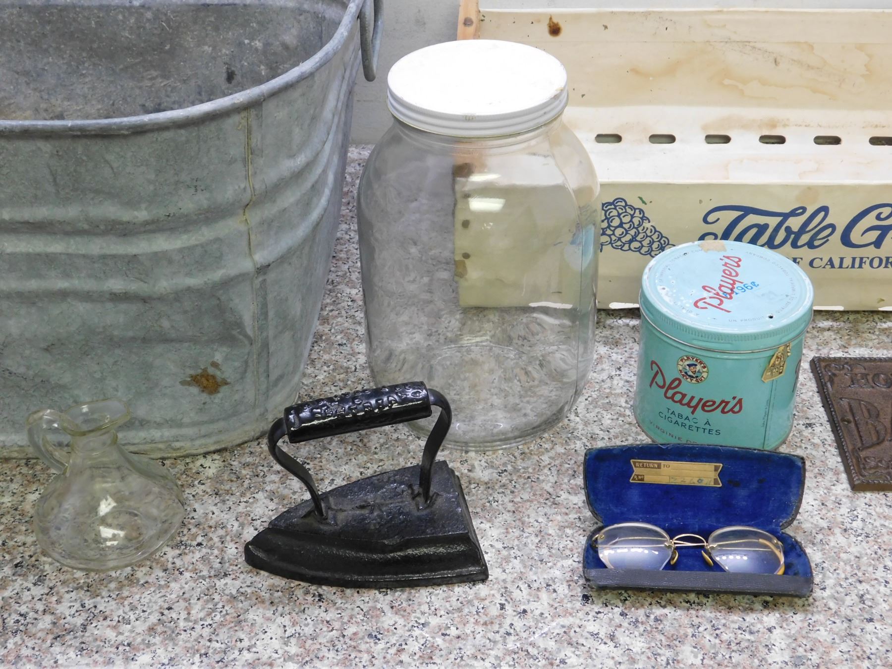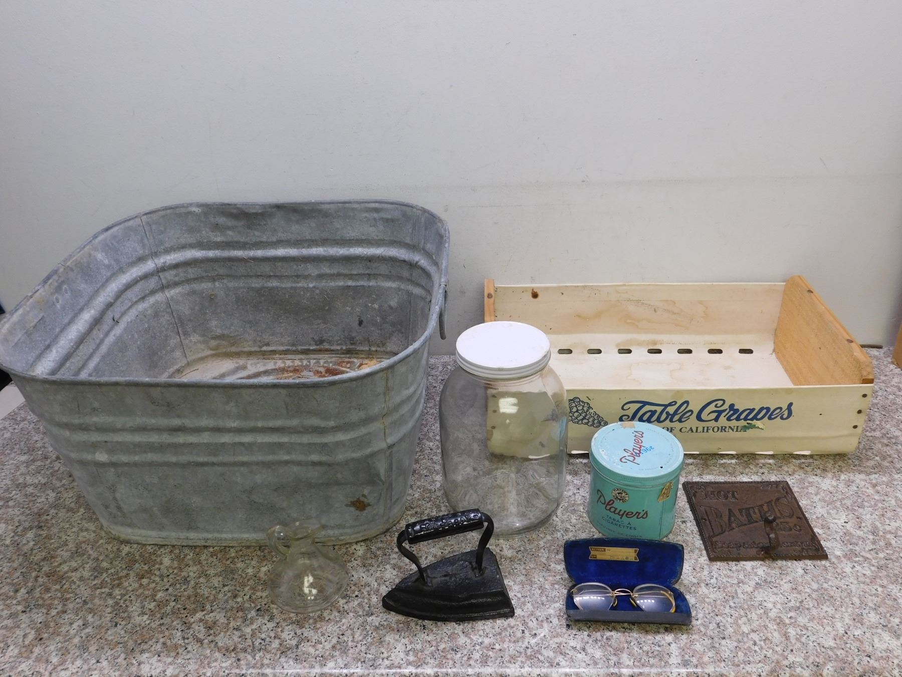 END OF THE RUN Metal Tray, Wooden Grape Box, Jar, Glasses, Sod Iron, Hook, Etc