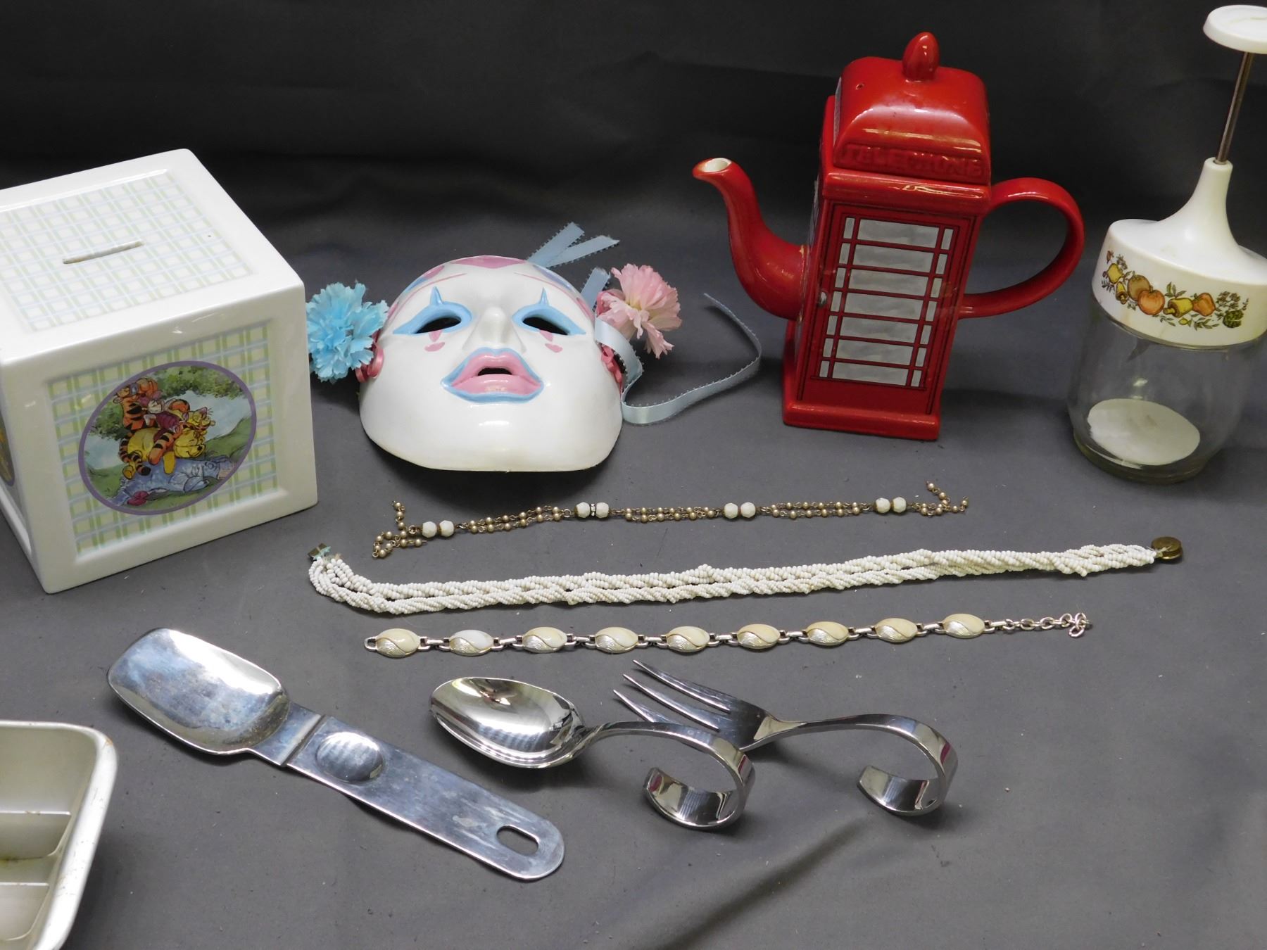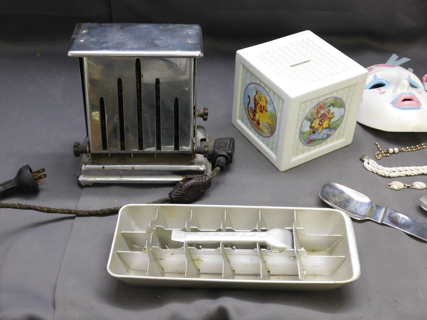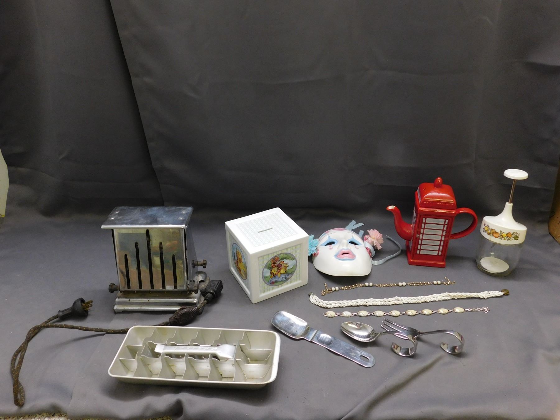 END OF THE RUN Vintage Toaster, Metal Ice Tray, Gemco Hand Slicer, Mask, Coin Bank, Necklaces etc