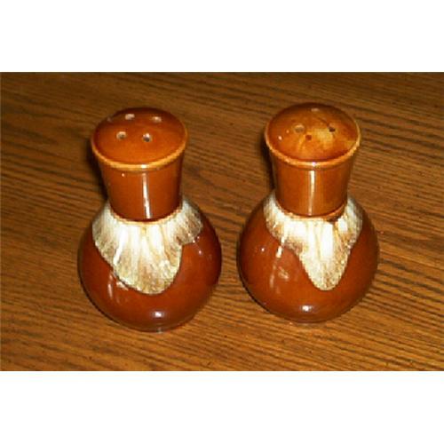 Featuring Enesco Brown Drip designed, salt/peper set. Salt shaker has 3 holes; pepper shaker has 4 holes. Silver/red sticker still attached: ENESCO IMPORTS. These shakers match McCoy, Hall, or Hull Brown Drip dishes perfectly. Both shakers measures 4 1/4 inches tall with top diameter of 1 3/4 inches and bottom base diameter of 2 inches. Both are in excellent condition.