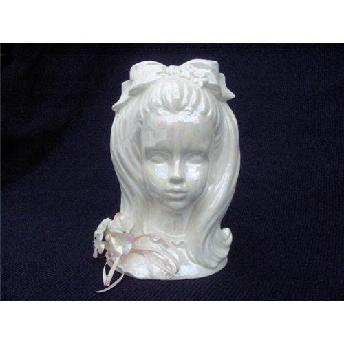 Enesco 6.75" Lady Head Vase. This lovely lady is in iridescent white. She has a bow in the front of her long hair. She also has iridesent pink flowers and pearls on her shoulder. Condition is vey good, with one small chip on the bottom side in the front. The original foil Enesco sticker is still present. See photos. Have a glance at my other items. Thank you for viewing.