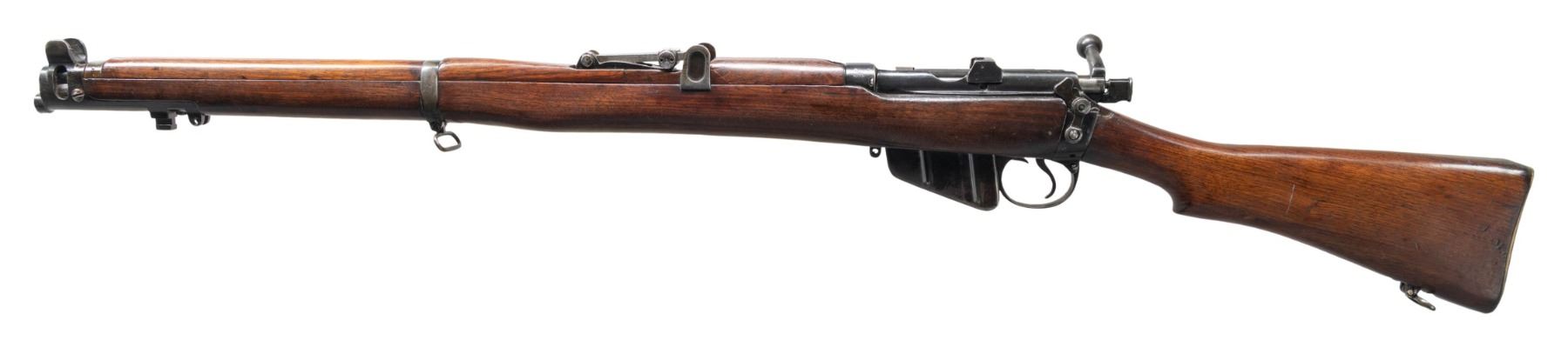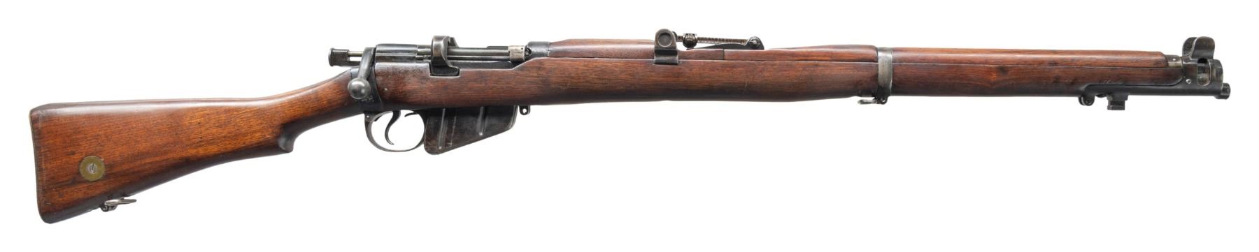 Cal. 22 LR. S# 9912. Bbl. 25 1/5'. Blade front sight with ears. Tangent rear sight graduated to 2000m. & elevation adjustment moves all the way. Matching numbers on receiver, nosecap & bolt. Forend number is illegible & rear sight is mismatched. British MKIII SMLE converted to 22 LR. Right side of socket has Enfield & "SHT '22 IV*" markings with appears to be a 1917 date. Left side of socket has '34 date. Left side of receiver has crown "BNP" proof. Left side stripper clip bridge screw missing. Arsenal rework blue finish. Walnut stock set with bottom mounted sling swivels. MAGS: 1 empty 10 rd without internals. CONDITION: refinished stock set has added finish with a couple notable handguard cracks behind rear sight, scattered dings & handling wear. Metal retains 30% mix of Suncorite & arsenal rework blue with overall thinning, fading to gray, wood finish overrun, edge wear, handling marks & some light oxidation. Action functions properly when hand cycled. Bright near excellent bore. (25-2875/MJC). CURIO. $300-500.
