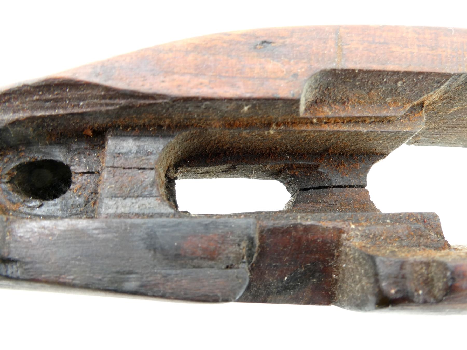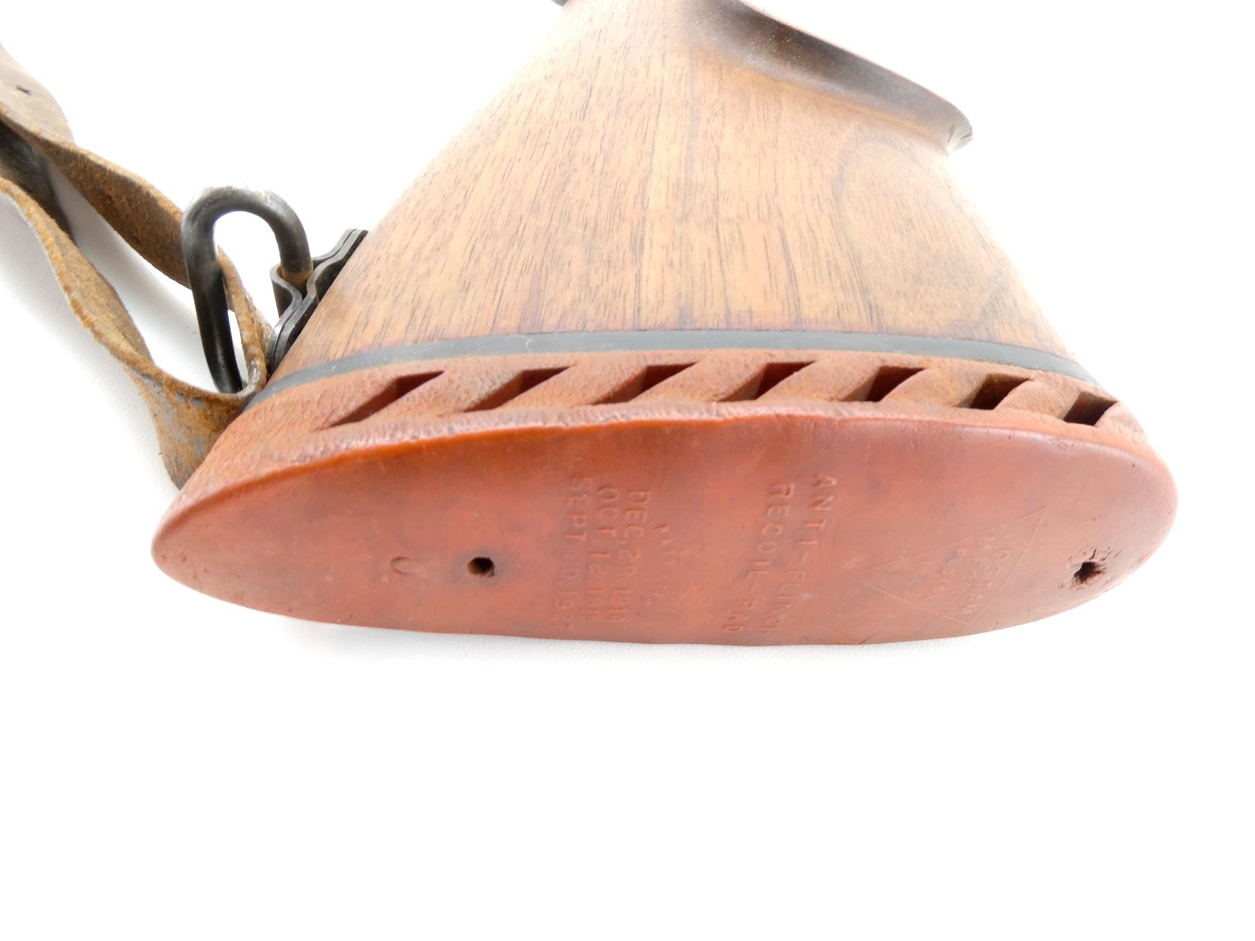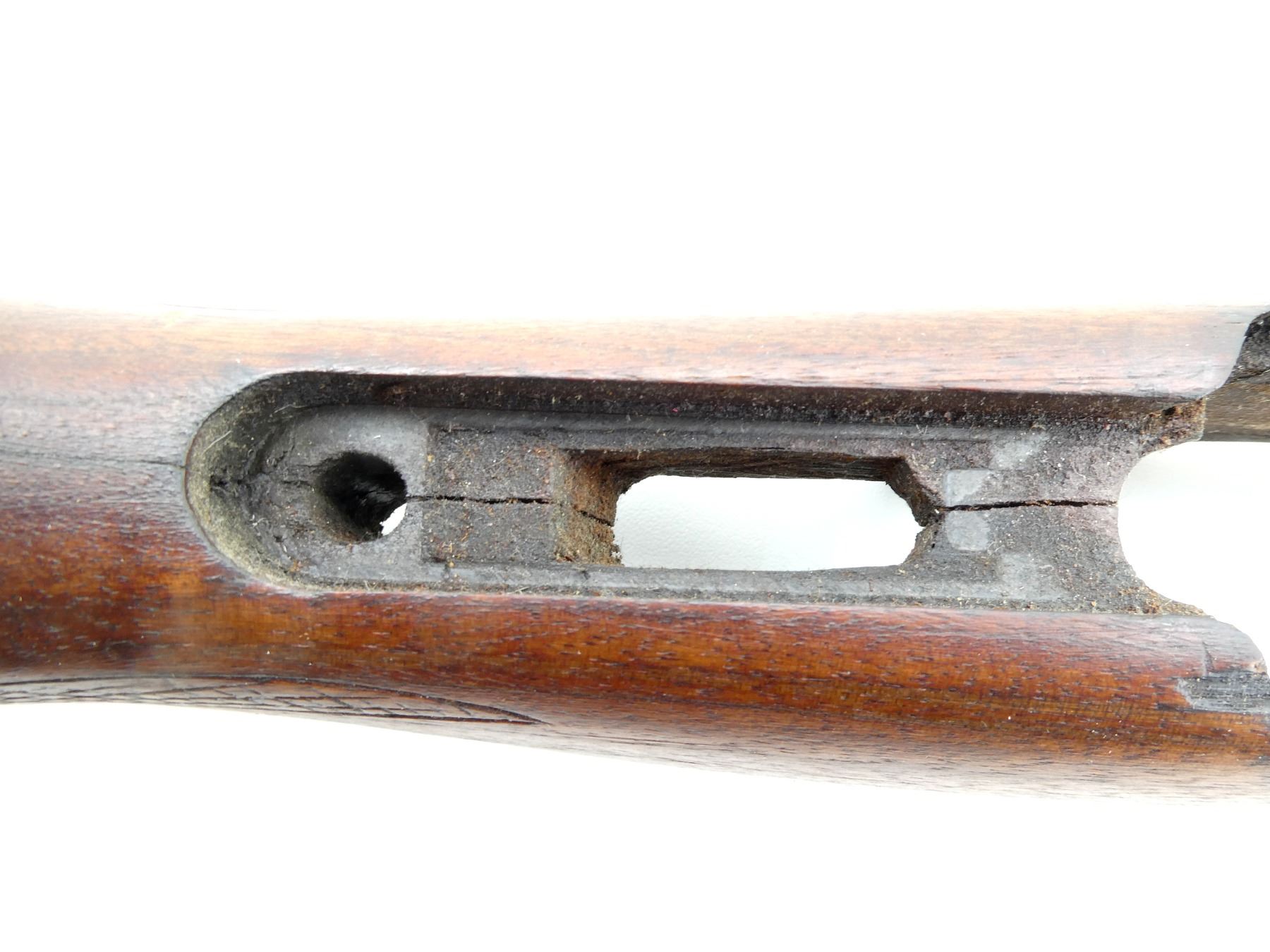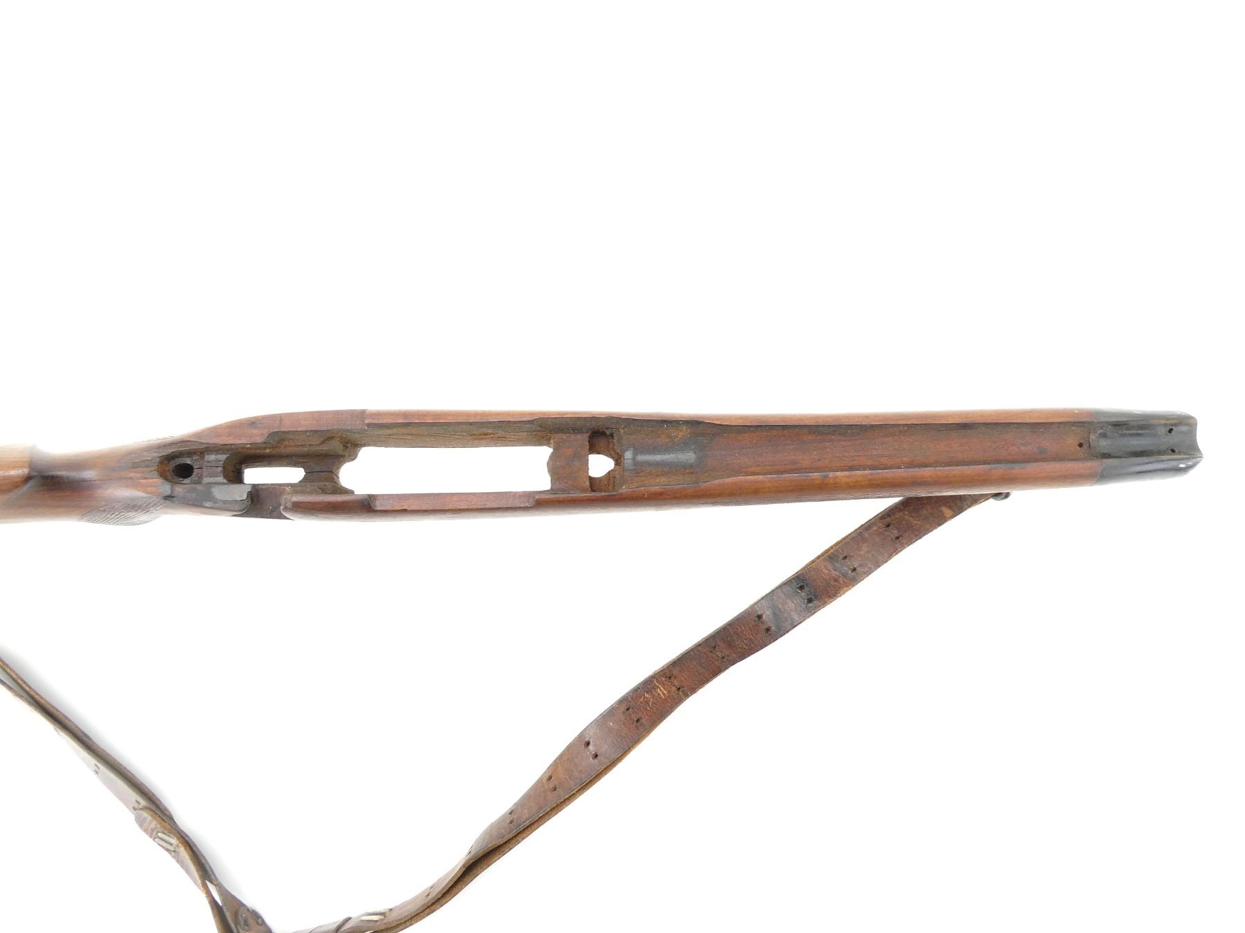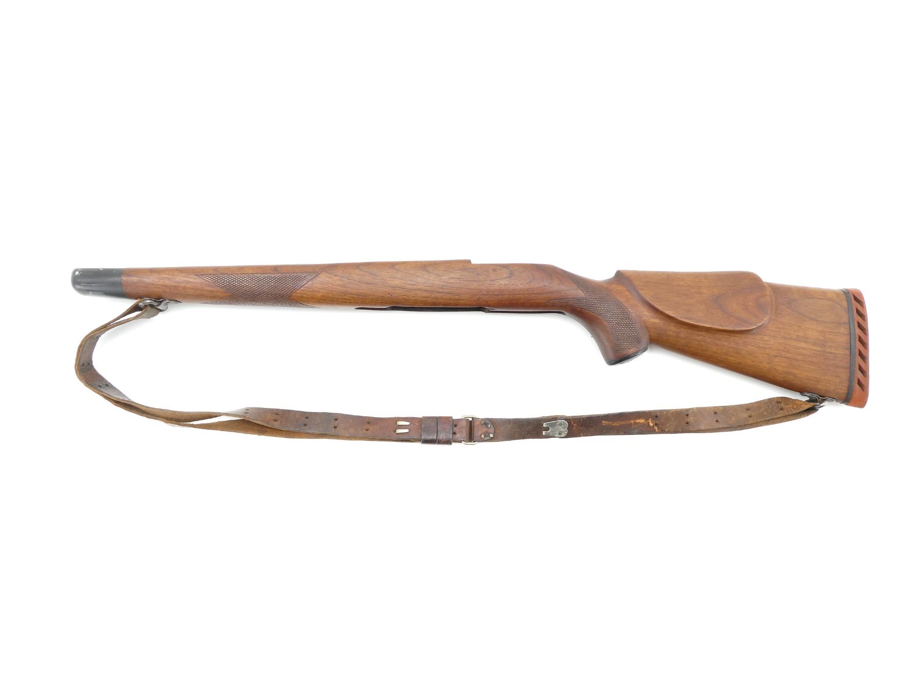 (1) WOODEN CONSTRUCTION, CHECKERED, UNMARKED, WITH RH CHEEK REST, SLING SWIVELS & RECOIL PAD, UNKNOWN BROWN LEATHER SLING ATTACHED, CRACKED INSIDE MAG WELL, OVERALL LENGTH APPROX. 32.75". MAY REQUIRE FITTING. SEE PHOTOS.