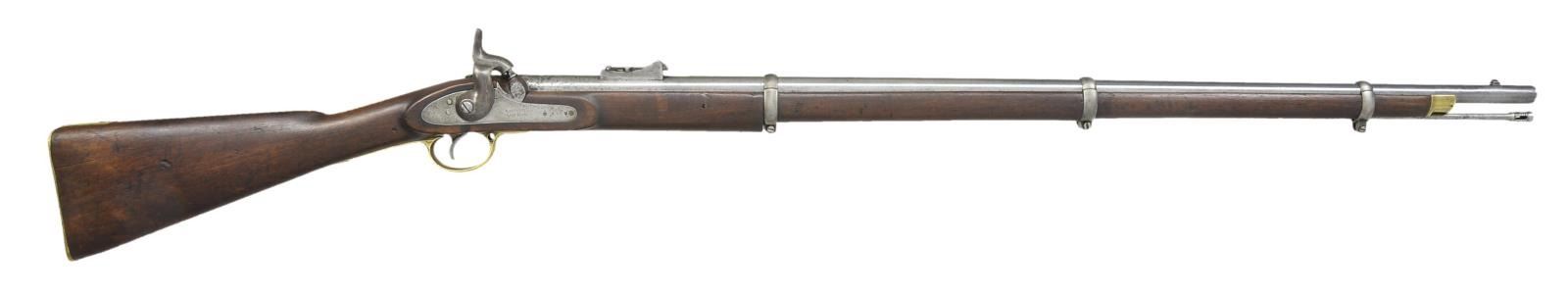 BLOSSUMS” REGIMENT. Cal. 58. NSN. Bbl. 39" w/ London proofs. Lock marked “BARNETT / LONDON”. Standard configuration brass mounted w/ 3 iron clamping bands, long-range adj. rear sight. Buttplate tang stamped “566” which may have been ordnance inventory number. Statement of Ordnance & Ordnance Stores on Hand … "During the First Quarter Ending March 31, 1863 shows 124th were armed w/ over 500 Enfields in both .577 & .58 caliber". Wartime photographs also show Enfields in the hands of 124th NY enlisted men. This musket descended in the family of 1st Lieut. William Brownson whose insignia & sword were sold in another lot in the sale. One of the 124th regimental histories state that two thirds of the men elected to buy their muskets at the end of the war after the Grand Review in Washington. Even though Brownson, the regiment’s adjutant had left service due to his wounds at Chancellorsville, somehow he ended up w/ a souvenir as it has remained in his family till now. CONDITION: good to very good overall, complete & matching other than missing sling swivels. Metal is cleaned but markings all discernible. Stock is been lightly sanded, too hairline cracks on left side. Mechanically functional w/ discernible rifled bore. (01-19096/JS). ANTIQUE. $800-1,200.