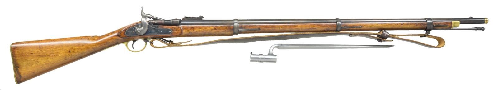 Cal. 577 Snider. NSN. Bbl. 36 1/2". Rifle appears similar to a MK1 Snider & is a conversion from an earlier 1853 Enfield. Lockplate is marked w/ British crown, "V + R", 1852 &Enfield. There do not appear to be any other British markings other than the lockplate & this rifle may well be a Nepalese made piece. Breechblock is unmarked. Buttplate, rear band & lower tang have Nepalese markings. Ladder rear sight w/ Nepalese graduations. Blade front sight. Ramrod present. Bottom mounted sling swivels w/ reproduction sling. Hardwood stock set. UNATTACHED ACCESSORIES: brass muzzle cork & Nepalese socket bayonet. Bayonet has no British markings and has a cleaned appearance w/ scattered light pitting & oxidation. No scabbard is present. CONDITION: refinished stock shows scattered handling wear & light dings. Cleaned brass triggerguard and buttplate show some dings & light oxidation. Hammer is a silvery gray patina & lockplate retains a strong amount of arsenal blue finish w/ scattered dings. Bbl., bands, & breechblock are turning brown w/ touch up blue, a few spots of light pitting & dings. Very good bore w/ some light pitting. (01-21072/MJC). ANTIQUE. $300-500.