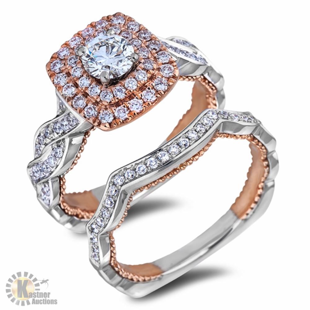 MATCHING WEDDING BAND. ENGAGEMENT RING WHITE AND ROSE GOLD STYLE: SGR1173 SIZE: 6.5 WEIGHT: 7.6 GRAMS METAL: 18K WHITE AND ROSE GOLD DIAMONDS CENTER DIAMOND 1=.41CTS COLOUR: H CUT: ROUND BRILLIANT CLARITY: VS2 SIDE DIAMONDS .52 CTS T.W. CUT: ROUND BRILLIANT COLOR: F/G CLARITY: VS GIA CERT #1223611018 RETAIL $7,350.00 SKU:133-17935 SGR1173. MATCHING WEDDING BAND STYLE: SGR1173W SIZE: 6.5 WEIGHT: 3.9 GRAMS METAL: 18K WHITE AND ROSE GOLD DIAMONDS 27= .18 CTS T.W. COLOUR: FG CUT: ROUND BRILLIANT CUT CLARITY: VS RETAIL $1,550.00 SKU:133-17936 SGR1173W