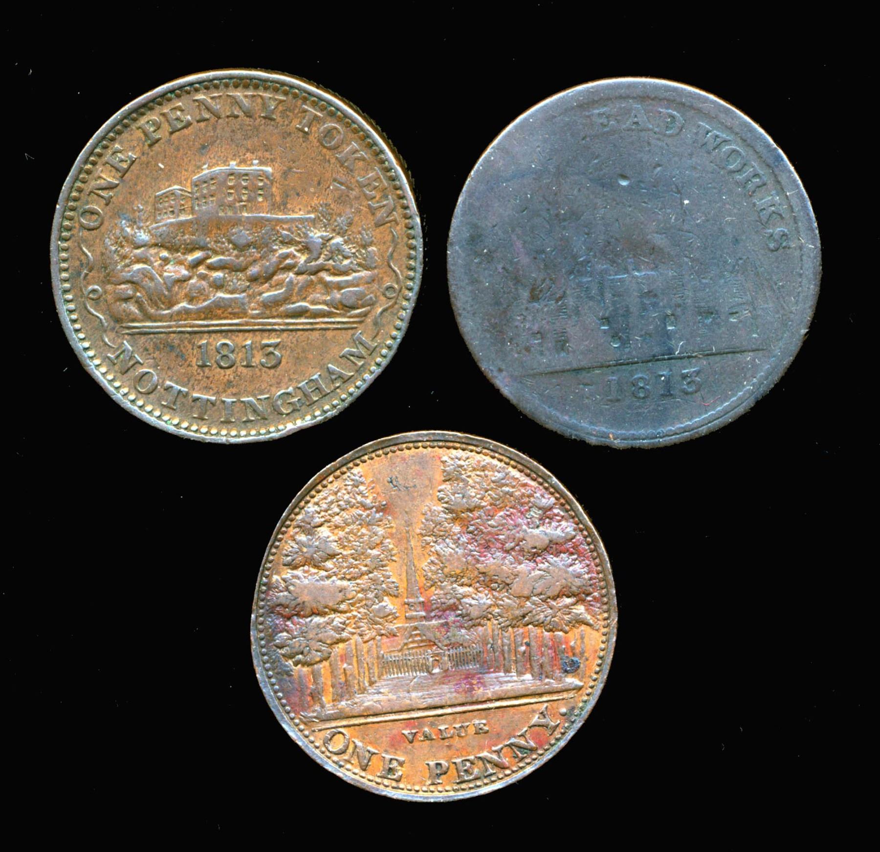 1 x 1813 Flint Lead Works 18.1 gm. Wi-1313 VG, 1 x 1813 Nottingham 21.5 gm. Wi-940 VF and 1 x 1812 Cheltenham 18.4 gm. with Reverse rim bump at 8 O'clock Wi-673 XF.
