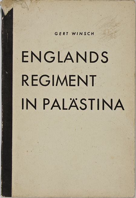 German propaganda publication, Englands Regiment in Palastina, by Gert Winsch, (Berlin: German News Service, 1940), 86pp. 8vo. This illustrated volume describes England's involvement in Palestine, particularly emphasizing the British repression of the Palestinians, plundering of Jerusalem, alleged massacres of Arabs by settlers, etc., with illustrations showing the British destroying Arab homes and villages, allegedly looting, the taking of prisoners, and "An Arab shot by a Jew being removed...". Slight wear to the spine, else very good.