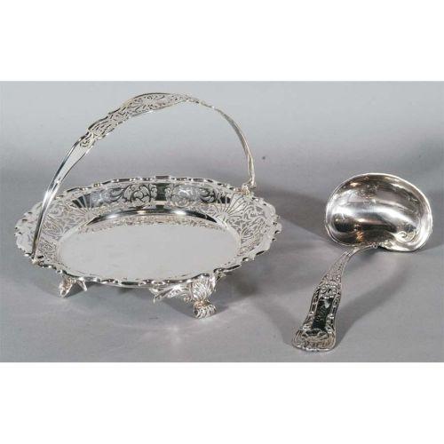 1 ENGLISH 10" STERLING BASKET together with an 11" GORHAM STERLING LADLE total weight 13 troy ounces CONDITION REPORT: light scratches. PACKING AND SHIPPING (excluding insurance) by Fairfield Auction to points within the Continental U.S.A. and Canada (all other international must be handled by 3rd party shipper) $30.