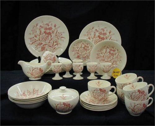 ENGLISH ALFRED MEAKIN inMEADOWVALEin HND PTD DINNERWARE INCLUDES (6) 9in DINNER PLATES EXCELLENT, (5) 6 1/2in BOWLS EXCELLENT, (6) CUPS EXCELLENT, (6) SAUCERS EXCELLENT, (6) EGG CUPS EXCELLENT, (1) PITCHER EXCELLENT (1) COVERED SUGAR (LID W/ FLAKE & INTERIO
