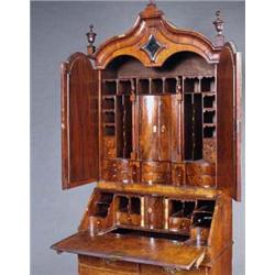 ENGLISH AND CONTINENTAL FURNITURE AND DECORATIONS - A Queen Anne walnut bureau-bookcase, enclosed by a pair of arched bevelled mirror doors beneath a curving cavetto moulded cornice with mirrored lozenge panel beneath urn finials, the interior well fitted with pigeonholes, shaped drawers, folio compartments, centred by a pair of concave doors enclosing drawers and pigeonholes, an urn capped slender pillar drawer to each side, the bureau with matched burr veneers and outlined with herringbone bandings, the flap with book-rest and enclosing a shaped and fitted interior with sliding well beneath a pair of candle slides, two short and two long drawers under, pierced brass handles and escutcheons, 38.75in wide, 99in high, 23in deep, c.1705 (feet replaced, old restorations) (see illustration)