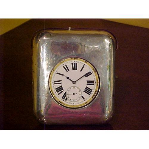 A VERY HANDSOME ENGLISH SILVERCASED TRAVELLING CLOCK. THE HALLMARKED ENGLISH SILVER CASE OPENS TO REVEAL A LARGE TRAVELLING WATCH WHICH WOULD HAVE GONE WITH A GENTLEMAN ON HIS TRAVELS ROUND THE COUNTRY. THE CASE IS LEATHER BACKED WITH A SMALL EASEL STAND . THE WATCH IS IN GOOD WORKING ORDER AND ALSO HAS A MINUTE DIAL.