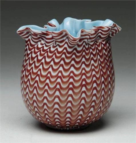 ENGLISH ART GLASS VASE. Nice English art glass vase has brown and white pull-up decoration with a pale blue cased lining and ruffled top. Attributed to Stevens & Williams. Unsigned. SIZE: 5" t. CONDITION: Very good to excellent. 5-62123