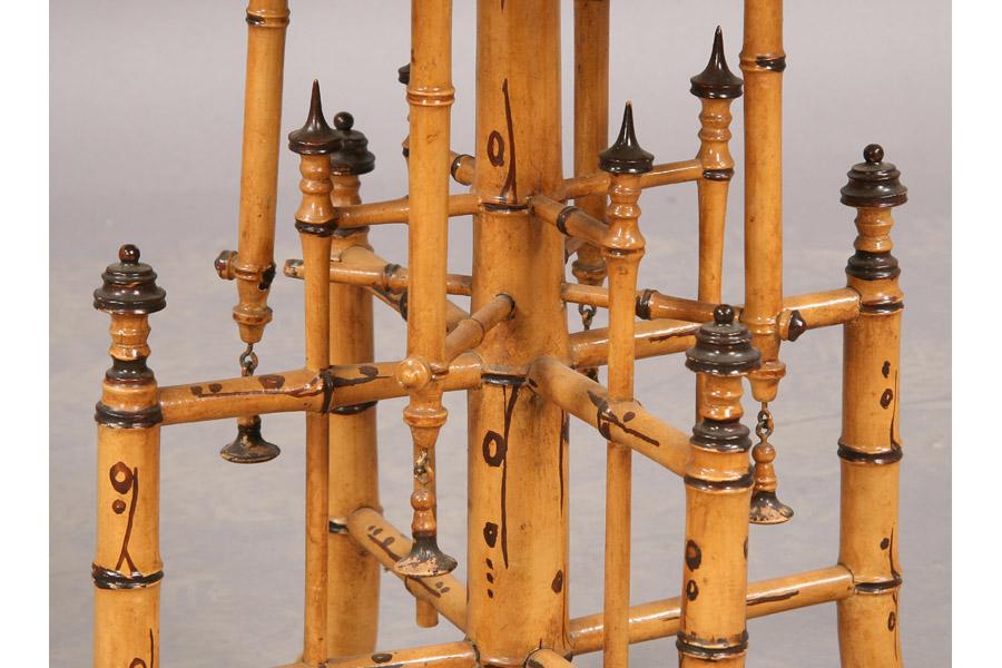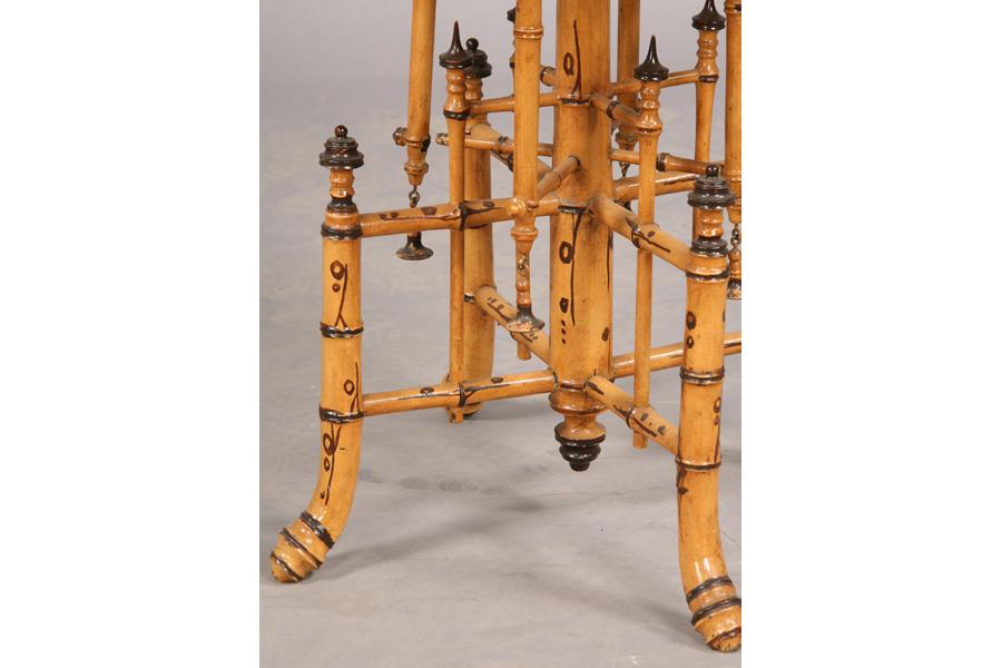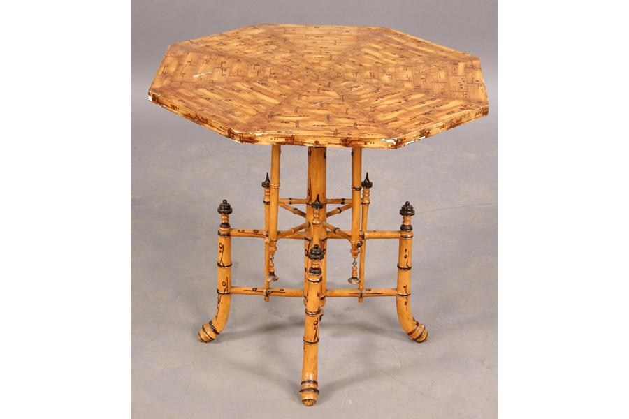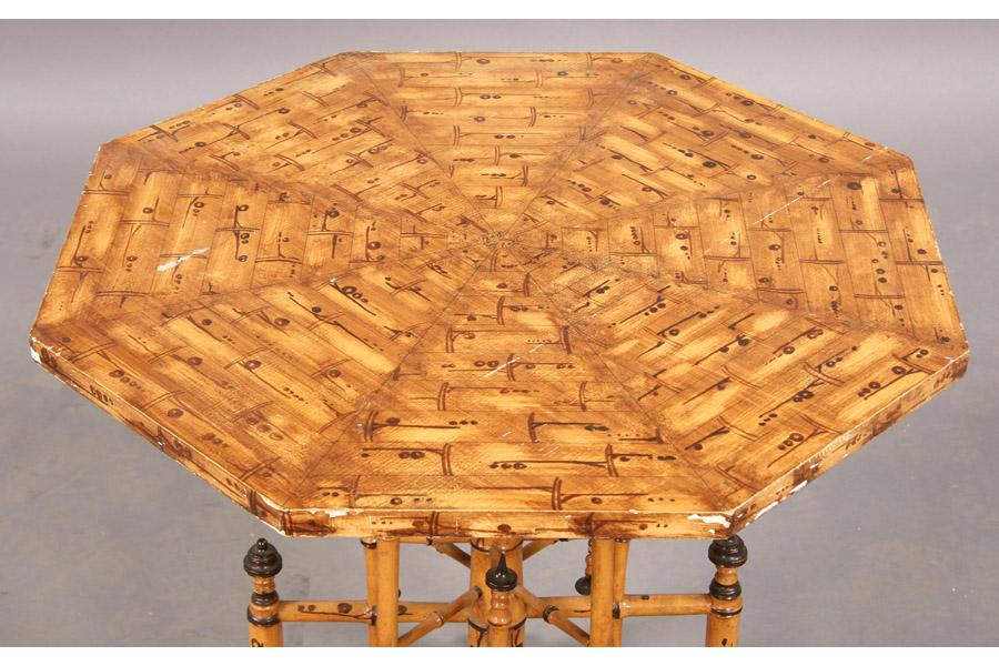An English bamboo faux painted Chinese Chippendale side table with octangular tops over bamboo base circa 1910. Ht: 22" Width: 22" Depth: 22" ***PLEASE NOTE: All property shall be paid for by the purchaser within five (5) business days of the sale. Kamelot Auctions accepts cash (In house only), personal checks, certified checks and money orders. We do not accept credit cards or Paypal under any circumstances. Please note our policy regarding payments from International buyers: The only acceptable method of payment is a bank wire/bank transfer. For invoices more than $1000, there is no additional fee for this service. For invoices less than $1000, please include an additional $25 wire fee. We will be happy to forward our bank wiring information after the completion of the auction. Thank you for your understanding and cooperation. All purchases must be removed within 15 business days after an auction. Property not removed from our facility after 15 business days will be moved to an off-site storage facility at a charge of $10.00 per day payable by the buyer. Kamelot does NOT provide shipping services or estimates. However, we recommend the following independent shipping services: Antique Transport Co. at antiquetransport@cs.com, Farren Transport at farrentransport@comcast.net or All Points Shipping at jb@allpointsshippingnj.com for quotations and shipping arrangements for furniture and other large items that would require a blanket wrap shipping company. For quotations and shipping arrangements for smaller items that would traditionally be shipped through UPS, please contact The UPS Store at store4744@theupsstore.com or The Packaging Store at hrpa112@aol.com. Clients are welcome to pick up their items from our location or make their own shipping arrangements.