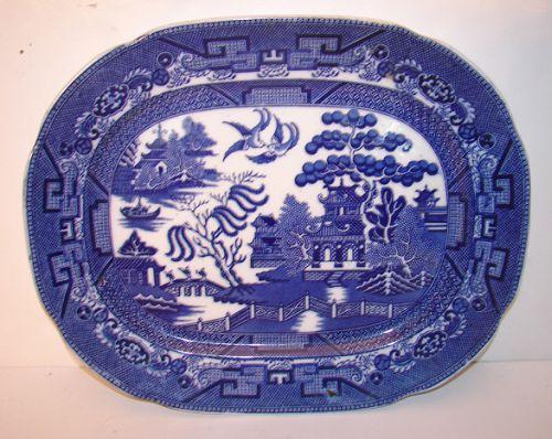 ALLERTONS LTD. (1929-1942) ENGLISH BLUE WILLOW PLATTER. Depicts an Oriental scene with building along river. Marked on bottom “Allertons/England/Willow/Made in England”. 13.75” L