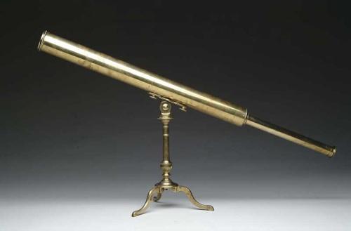 ENGLISH BRASS TABLETOP TELESCOPE BY YEATES & SON, DUBLIN. Brass two-draw telescope mounts on a folding Queen Anne style brass stand. Signed at end. SIZE: 15” h x 38-1/4” extended. CONDITION: Some tarnish and very light dents. Very good. 9-27147