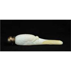 Lot 522 ENGLISH CAMEO DUCK BILL SCENT BOTTLE. Overlay colors of white over yellow with an engraved head of a duck. Original silver top, marked on underneath side. SIZE: 8-3/4” l. CONDITION: Very good to excellent. 5-69151 (4,000-6,000)