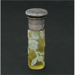 Lot 538 ENGLISH CAMEO SCENT BOTTLE. Cylindrical scent bottle has yellow background glass with beautifully carved flowers, branches and leaves topped with silver screw lid and collar. Collar is stamped "Theodore B Starr". Top of lid has hammered design with a ribbon monogram. SIZE: 2-1/2" t. CONDITION: Missing interior stopper, otherwise very good to excellent. 5-68912 (600-800)
