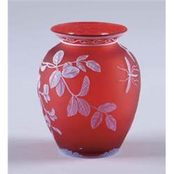 Lot 57 ENGLISH CAMEO VASE Brilliant red background with white floral design and dragonfly. Unsigned. SIZE: 4-1/2” t. CONDITION: Very good to excellent. 5-70250