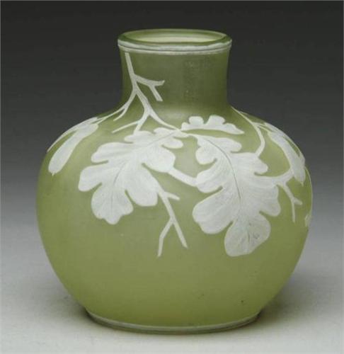 ENGLISH CAMEO VASE. Beautiful English cameo vase features acorns, leaves and branches on a pale green background. SIZE: 5-1/2" t. CONDITION: Very good to excellent. 5-62061