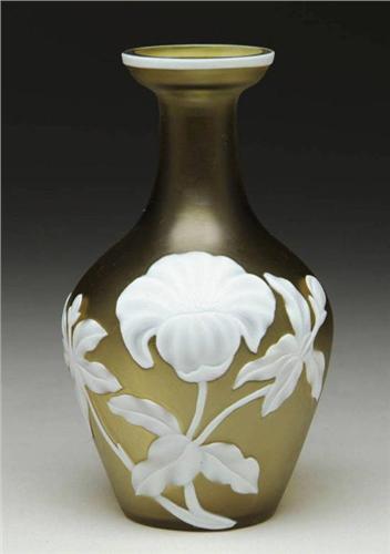 ENGLISH CAMEO VASE. Nice cameo vase has white flowers, leaves and vines against a yellow-amber background. Lip of vase is trimmed in white. SIZE: 5-1/4" t. CONDITION: Very good to excellent. 5-62369