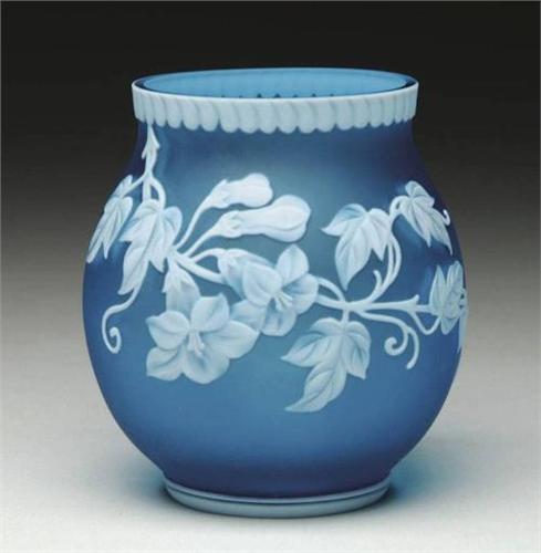 ENGLISH CAMEO VASE. Very pretty English cameo vase has white cameo flowers, leaves and stems against a beautiful blue background. Lip and foot are trimmed in white with cameo decoration on lip. SIZE: 3-3/4" t. CONDITION: Very good to excellent. 5-62160