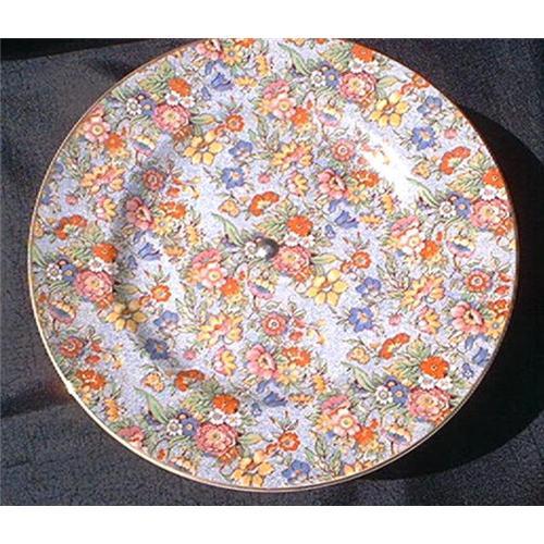 This is a beautiful chintz cake plate on a chrome base. It is colorful, bright and cheery with its many floral designs and reminds one of an English garden in full bloom. It is 3 1/4" tall with a 9" plate. It is marked Midwinter Porcelon Burslem England and in very good condition. The plate is perfect with no chips or cracks and the gold trim is good.