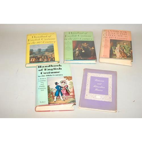 ENGLISH COSTUME. A Group of 5 Volumes as Listed. Good Condition. NOT EX-LIBRARY. ***Handbook of English Costume in the 16th, 17th, 18th & 19th Century - 4 Volumes by C. Willett & Phyllis Cunnington (1954-1959) 1st Editions, London: Faber and Faber Limited. 8vo, hardcover, with Dust Jackets, protected in mylar covers (price clipped). Some foxing, slight lean, binding & hinges tight. ***Exhibition of Victorian and Edwardian Dresses - Metrpolitan Musuem of Art - March 13th to April 23rd, 1939, New York. 8vo, soft cover, 6pp, 60 b/w plates on glossy paper. Pencil notation on two plates, occasional foxing, owner's name inside cover.