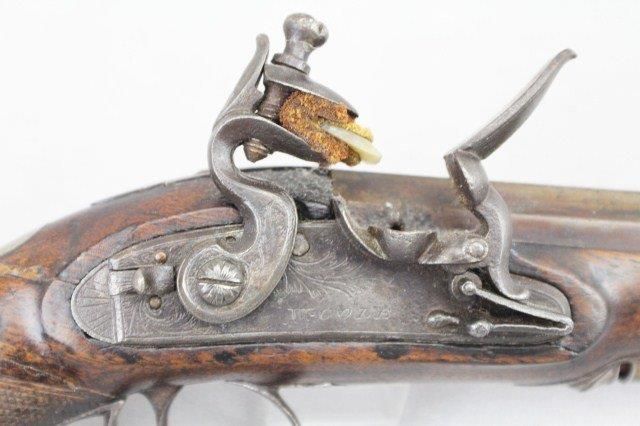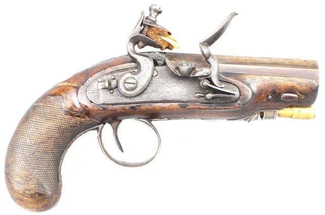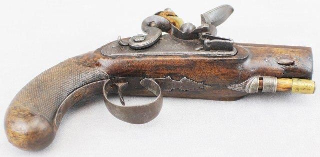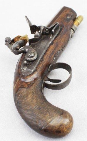ENGLISH FLINTLOCK POCKET PISTOL BY W COLE 60 cal, 3.5 inch octagonal barrel. Foresight. Folliate engraved lock engraved W Cole. Lock and cock is in working order. Walnut stock with steel fittings and replaced ramrod. some old repairs to stock. Size: