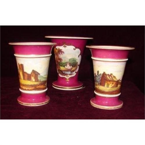 Circa 1820 English Three Piece Garniture set of three vases in Excellent Condition and Very Good Quality. No chips, cracks or restoration. The two smaller vases measure 4 1/2" in height and 3 1/2" in diameter across the top. Nice landscape scenes with a white beaded relief around the vases above and below a finely painted landscape scene. The larger vase measures 5" in height and 4 3/4" in diameter at the top of the vase. The only mark is on the larger vase. We can email a image of that mark of a 1 over 113 over a upside down (inverted) V with a . (dot). The larger vase appears not to match exactly with the two small vases as their is a slight difference in the landscape. The colors are identical. There is not a beaded border on the larger vase and the bottom and top borders differ minutely.
