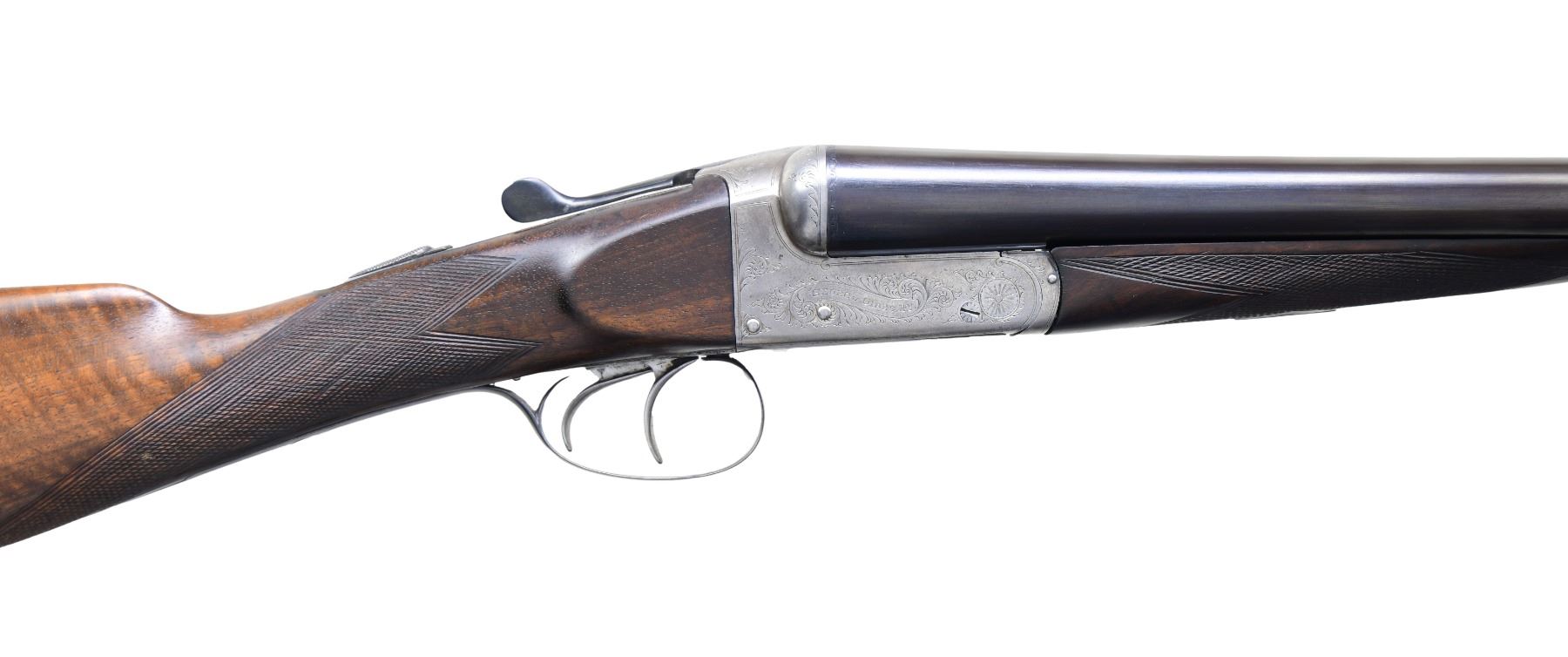SXS GAME GUN Cal. 12 Ga, 2 1/2". S# 7706. The 28" barrels have swamped game rib with brass bead. Fixed Mod & Full chokes. Water tables shows Birmingham Proofs of 2 different eras indicating professional restoration work, Nitro proofs for 2 1/2" chambers & "13/1" & ".729" barrel thickness. Boxlock action with acanthus scroll engraving. Features dbl. triggers, H&H style ejectors & auto-safety. Checkered walnut stock set. Splinter forearm with push button release & matching numbered iron. Straight grip buttstock with oval toeline name plate. LOP: 14 1/4" to red pad. WEIGHT: 6 lbs., 10 oz. CONDITION: barrels have good re-blackened barrels with prior pitting & marks. Action has gray patina appearance with re-blackened floorplate & triggerguard. Lightly sanded & refinished wood shows re-cut checkering & marks. Shiny bores show scratches & fouling. (24-6930/MD). MODERN. $600-1,000.