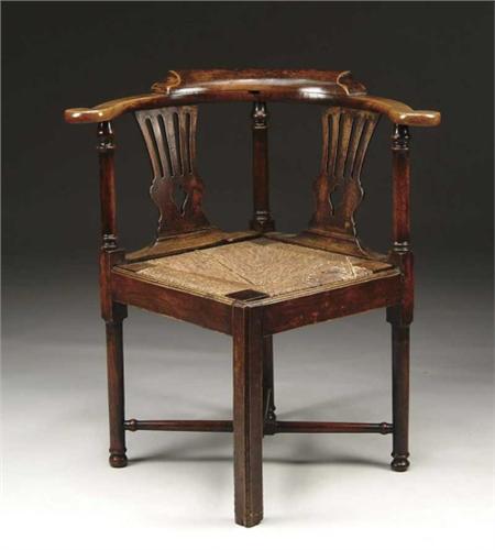 ENGLISH GEORGIAN CORNER CHAIR. Curved flat arms with stepped curving crest. Double pierced splats. Three back turned arm supports, molded edge seat rail, front square molded edge leg and three turned back legs. All supported by a turned and block X-stretcher. Rush seat set in seat which is as is. SIZE: 32” h x 17-1/2” seat h x 29-3/4” across arms. CONDITION: Some old repairs, some evidence of insect. Otherwise good. 9-27081