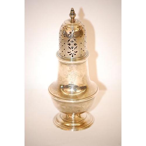 ENGLISH GEORGIAN SILVER SUGAR CASTOR-LATE 18TH CENT. W/ HALLMARKS, PIERCED & ENGRAVED CAP W/ ACORN FINIAL, BASE W/ AMORIAL FAMILY CREST W/ STAG (7" T) - WEAR, IMPERFECTIONS