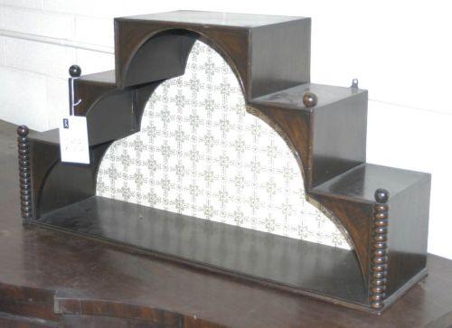 ENGLISH HANGING STEPPED SHELF, dovetailed, 32" wide, 18" high, 8" deep, circa 1840, lacking two balls, otherwise excellent, PACKING AND SHIPPING (excluding insurance) $40,