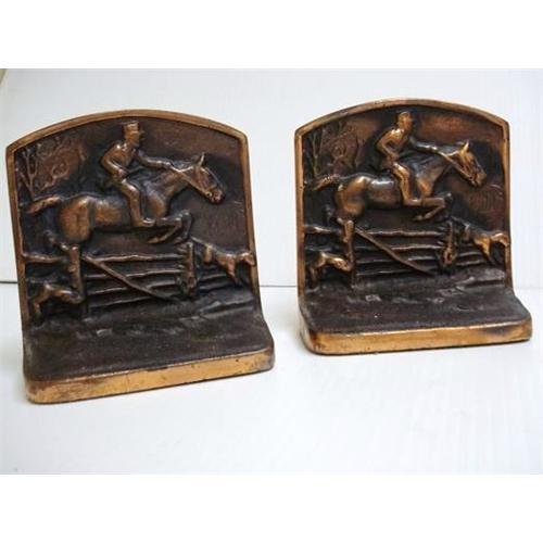 RARE AND VERY HEAVY PAIR OF BOOKENDS, DEPICTING ENGLISH HUNTING SCENE, HORSE AND THE HUNTER JUMPING OVER THE FENCE WITH TWO DOGS RUNNING, IT IS BEAUTIFUL, THESE ARE EXTREMELY HEAVY, WEIGHING ABOUT 9 POUNDS, THEY ARE MADE FROM WHAT IT SEEMS TO BE BRONZE, NOT SURE, THEY ARE MADE TO SUPORT HEAVY LARGE BOOKS AND TO LAST FOR EVER!, Each measures about 5 1/4 inch high x 4 3/4 inch wide, US Buyer to pay 15.00 for shipping plus insurance.THANKS.