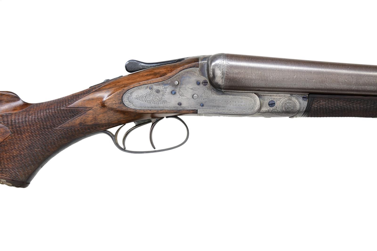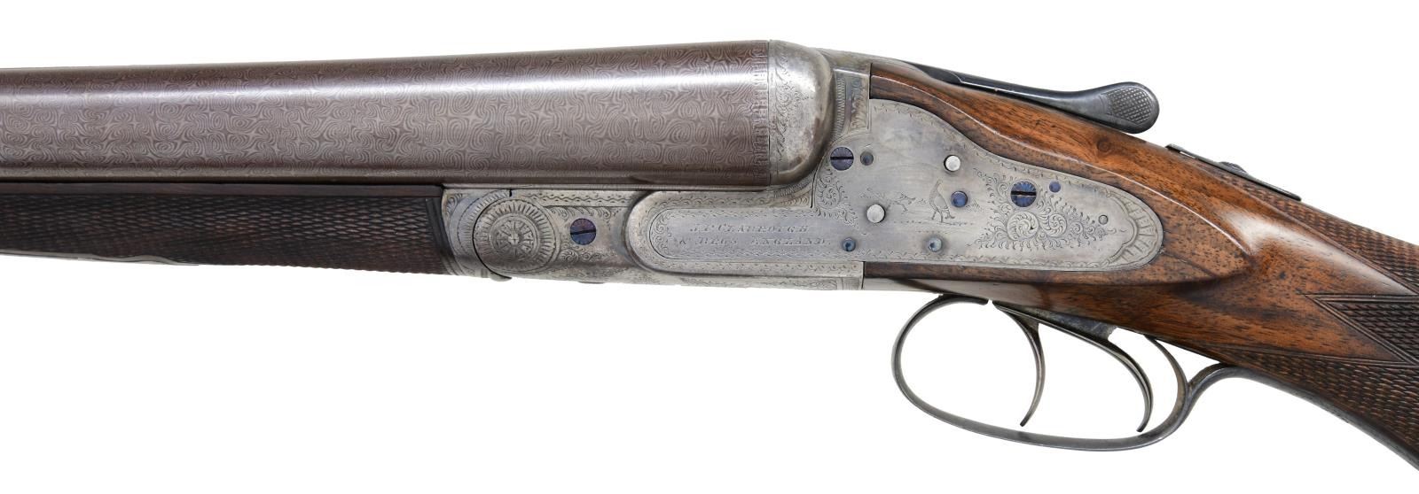 SXS SHOTGUN. Cal. 10 Ga., 2 7/8". S# 5670. The brown Damascus 32" barrels have matted rib with doll's head extension, bright front bead & engraved "J.P. CLABROUGH & BROS, LONDON, FINE DAMASCUS". Water tables have original London proofs on barrels along with later Birmingham Nitro proofs chambers for 2 7/8" shells. Engraved acanthus scroll engraving on locks & receiver along with engraved pheasants on right lock & quail on left lock. Receiver marked on water table "MAKER'S PATENT ACTION 257764"; forearm iron has "PATENT EJECTOR / 5670 / NP 481290". Small screws in action & forearm iron have nitre blue. Blued top lever, safety switch & triggerguard with border engraving. Triggerguard bow has engraved quail & setter scene. Action has cocking indicators, double trigger & auto-safety. Walnut splinter forearm with Deeley style release, ebony tip, & point pattern checkering. Walnut buttstock with point pattern checkering, fluted comb & horn pistol cap. LOP: 13 3/4" to horn J.P. Clabrough & Bros buttplate. DAC: 1 3/4". DAH: 2 1/8". Cast is neutral. WEIGHT: 8 lbs., 13 oz. BORE DIAMETERS: L - .779", R - .776". CHOKE CONSTRICTIONS: L -.059", R - .055". MINIMUM WALL THICKNESS: L - .042", R - .050". CONDITION: barrels have good damascus pattern with light brown refinish showing scattered cleaning pitting, spots of oxidation & small dents. Receiver has faded case colors in protected interior areas; overall gray patina. Nitre blue has light fading colors. Triggerguard has reblued finish. Very good forearm finish with one small gouge in left barrel channel. Forearm has lightly sanded & refinished wood with recut checkering, crack behind left lock, blistering finish around comb & end of wrist checkering & along toeline. Buttstock has scattered deep impressions mostly along toeline. Good buttplate. Action appears tight on face. Ejectors appear in time. Bright shiny bores with spots of light pitting forward of chambers & one area of fouling in right bore. (01-25336/MD). ANTIQUE. $1,500-2,000.