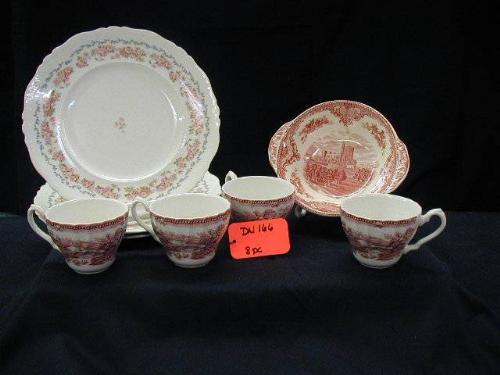 ENGLISH, JOHNSON BROS. ASST PATTERN LOT INCLUDES (3) 10in PLATE BORDEAUX ROSES (2 W/RIM CHIPS) (1) CEREAL BOWL OLD BRITIAN CASTLES (W/HAIRLINE & CHIP), (4) CUPS EXCELLENT, 8 PC