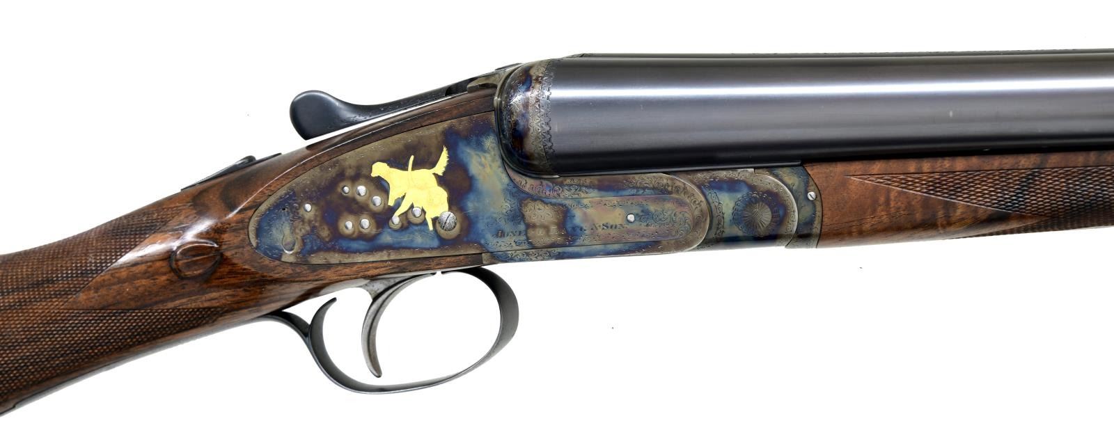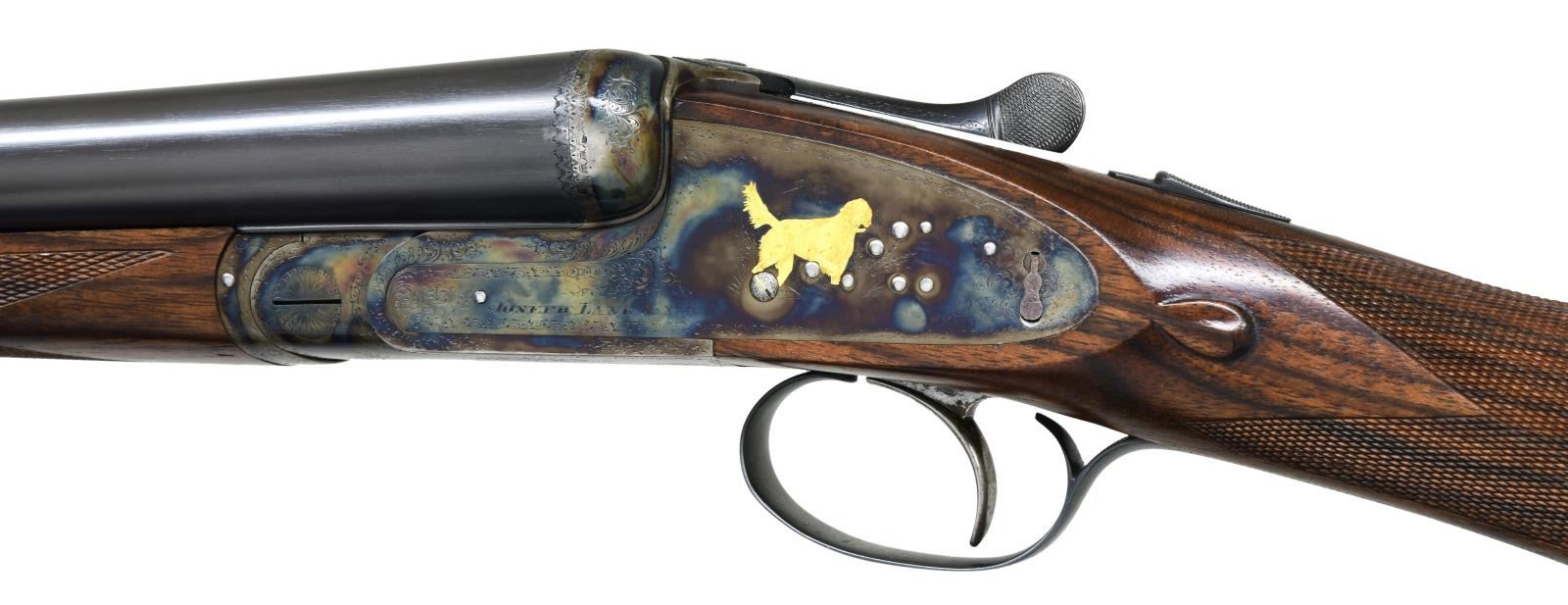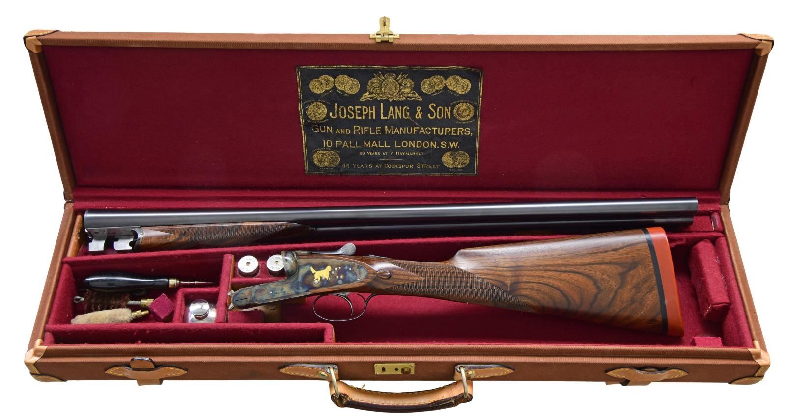 GAME GUN. Cal. 12 Ga., 2 3/4". S# 15559. The 27" fluid steel barrels have plain concave tapered tip rib missing front bead. Top of barrels engraved "JOSEPH LANG & SON, 102 NEW BOND STREET LONDON / ABERCROMBIE & FITCH CO. NEW YORK USA"; bottom of barrels are marked with "J.L & S", S# and "FOR 2 3/4" SHELLS". Polished water tables on barrels have London proofs. Keylock sidelock action has strong vivid case hardened finish accented with light acanthus scroll engraving along the borders; engraving extends to breech ends of barrels, trigger plate, trigger guard, top tang & forearm iron. Receiver adorned with gold inlaid setters & pointers on locks within an engraved woodland scenes; gold inlays include retriever bust inlay on bottom & "SAFE" on top tang. Action features single non-selective trigger, auto-ejectors & auto-safety. Custom splinter forearm with point pattern checkering & Anson type push button release. Custom English straight grip stock of English walnut with carved tear drops behind locks, point pattern checkering. LOP: 14 1/4" terminates to Pachmayr red pad. DAC: 1 3/4". DAH: 2 1/2". BORE DIAMETERS: R- .729", L- .729". CHOKE CONSTRICTIONS: R- .04", L - .09". MINIMUM WALL THICKNESS R - .025", L - .029". Slight cast off. WEIGHT: 6 lbs., 10.8 oz. UNATTACHED ACCESSORIES: canvas & leather English fit case with red fabric interior & Joseph Lang & Son label on interior of lid. Case contains nickel snap caps, oil bottle, mop, brush, turn key & turn screw modified to open latches. Case has very good condition with light fraying to fabric on interior. CONDITION: near excellent with custom refurbished stocks & metal finish. Barrels have very good to near excellent barrel rust blue showing a few scattered areas of marks & scratches. Near excellent vivid case colors., triggerguard & top lever blue. Near excellent wood finish with few scattered light impressions & 1 minute wood inlet repair bottom left in front of forearm iron. Bright shiny bores showing light streaks of fouling. (24-2187/MD). CURIO. $7,000-9,000.
