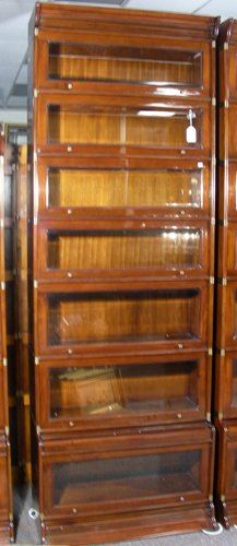 A stackable bookcase with seven individual lift doors with beveled glass fronts. Excellent condition. 95" high, 33" wide.