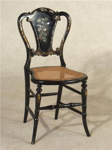 SIDE CHAIR: English mid Victorian side chair, ebonized ground with gilt penwork, mother of pearl and hand painting, cane seat, turned front legs and stretcher. Note: three old repaired breaks.