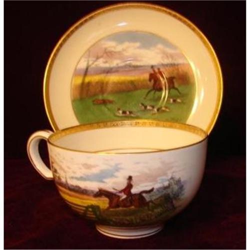 19TH. Century Large Cup and Saucer with a well painted fox hunting scene on both the cup and saucer. Also gilded around the edges on both pieces. This was at one time part of a full service of formal dinnerware. Years ago we had dinner plates, soup bowls, luncheon and dessert plates, but we have not seen these pieces in years. The scenes are signed by the artist-T.E. DEAN. On the back of both the cup and saucer is the maker's mark-"MINTON" Which was a very fine porcelain factory in London from the Early 1800's. Also it bears the name of the retail store in New York who had sold these pieces--Davis Collingsworth Co. at 789 EAST 52ND STREET IN NEW YORK CITY. The cup measures 4" in diameter and the saucer measures 6 1/2" in diameter. Inside the cup is a X mark which probably meant it was a second as Meissen would put a line thru the crosssed sword mark.