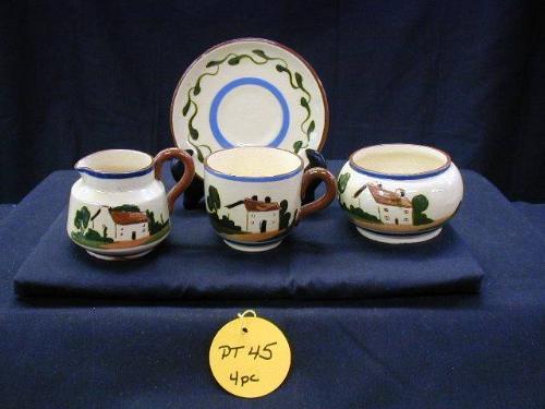 ENGLISH MOTTOWARE ROYAL WATCOMB TURQUAY 3 PC SET INCLUDES (1) CUP & SAUCER FEATURES HOUSE inTAKE A CUP OF COFFEEin (SAUCER HAS HAIRLINES) (1) OPEN SUGAR 2 1/2inD X 2inT inHELP YOURSELF AND DON'T BE SHYin EXCELLENT, (1) CREAMER inEVERYTHING HAS A BRIGHT SIDEin (