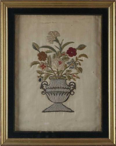 ENGLISH NEEDLEWORK CHENILLE AND BEADWORK PICTURE. A large two handled white and silver vase made of clear and silver beads with wire needlework edges and handles. A spray of flowers in colorful chenille work. All on a white silk background. Nicely housed in a shallow shadowbox frame with reverse painted border in black and gold. SIGHT SIZE: 18-1/4” x 13-3/4”. CONDITION: Generally very good, horizontal split to back top of silk background and one noticeable hole on right side. 9-27146