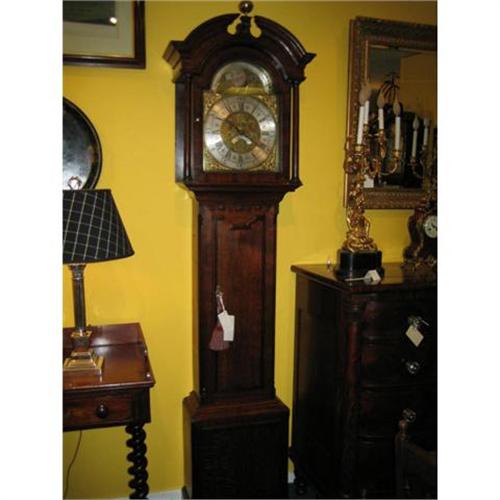 FABULOUS ENGLISH LONGCASE CLOCK BY LISTED ENGLISH CLOCKMAKER JOHN HUTCHINSON, BARSTALL WITH SILVERED CHAPTER RING, MOONPHASE AND CALENDAR RING. THE HOOD OF THE CLOCK HAS A NICELY ARCHED PEDIMENT WITH A BRASS FINIAL. THE CLOCK STRIKES THE HOUR ON A BELL. THE CASE AND THE MOVEMENT ARE TOTALLY ORIGINAL WITH ORIGINAL WEIGHTS AND KEY CRANK. THE MOVEMENT HAS BEEN FULLY OVERHAULED BY A MASTER CLOCKMAKER AND HAS A 2 YR WARRANTY ON THE MOVEMENT. IT WAS MADE CA 1780. ALL CLOCKS SOLD BY US ARE IN GOOD WORKING ORDER KEEPING GOOD TIME WHEN PROFESSIONALLY SET UP. THE DOOR OF THIS CLOCK CASE IS INLAID ALL AROUND THE EDGE TO GIVE A NICE QUALITY LOOK. THE HOOD OF THE CLOCK IS QUITE UNUSUAL AS YOU CAN SEE IN THE CLOSE UP PHOTO, THE GLASS AND THE DIAL ARE ALL ORIGINAL.