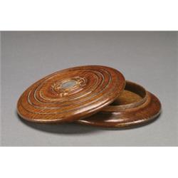 ENGLISH OAK MEMENTO SNUFF BOX, of turned flattened form, the top centred with silver boss, engrav...