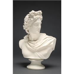 ENGLISH PARIAN BUST OF APOLLO BELVEDERE, after the Antique, raised on a socle base, published by...