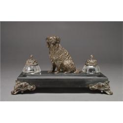 INKSTAND, of rectangular shape on four moulded feet, fitted two cut glass wells flanking a seated retriever with sprung lower jaw,