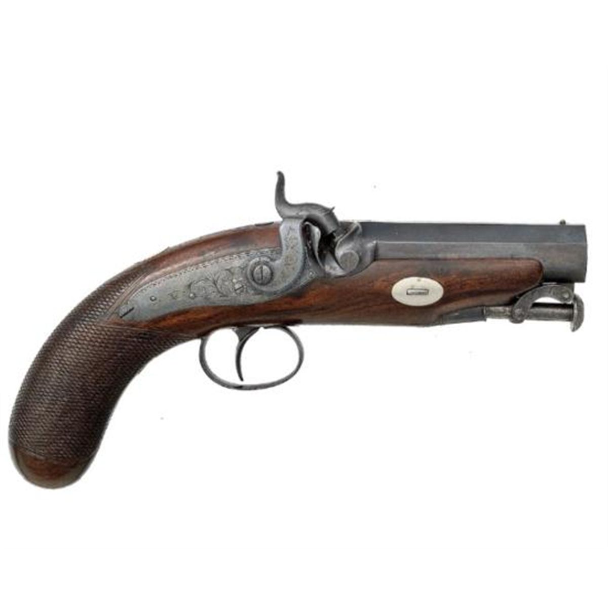 ENGLISH PERCUSSION BELT PISTOL, .62 caliber smoothbore, 4in octagonal barrel with engraved patent breech; engraved back-action percussion lock; engraved steel triggerguard; swivel ramrod. German silver escutcheons with German silver thumbprint behind tang. Checkered walnut stock with steel belt hook.